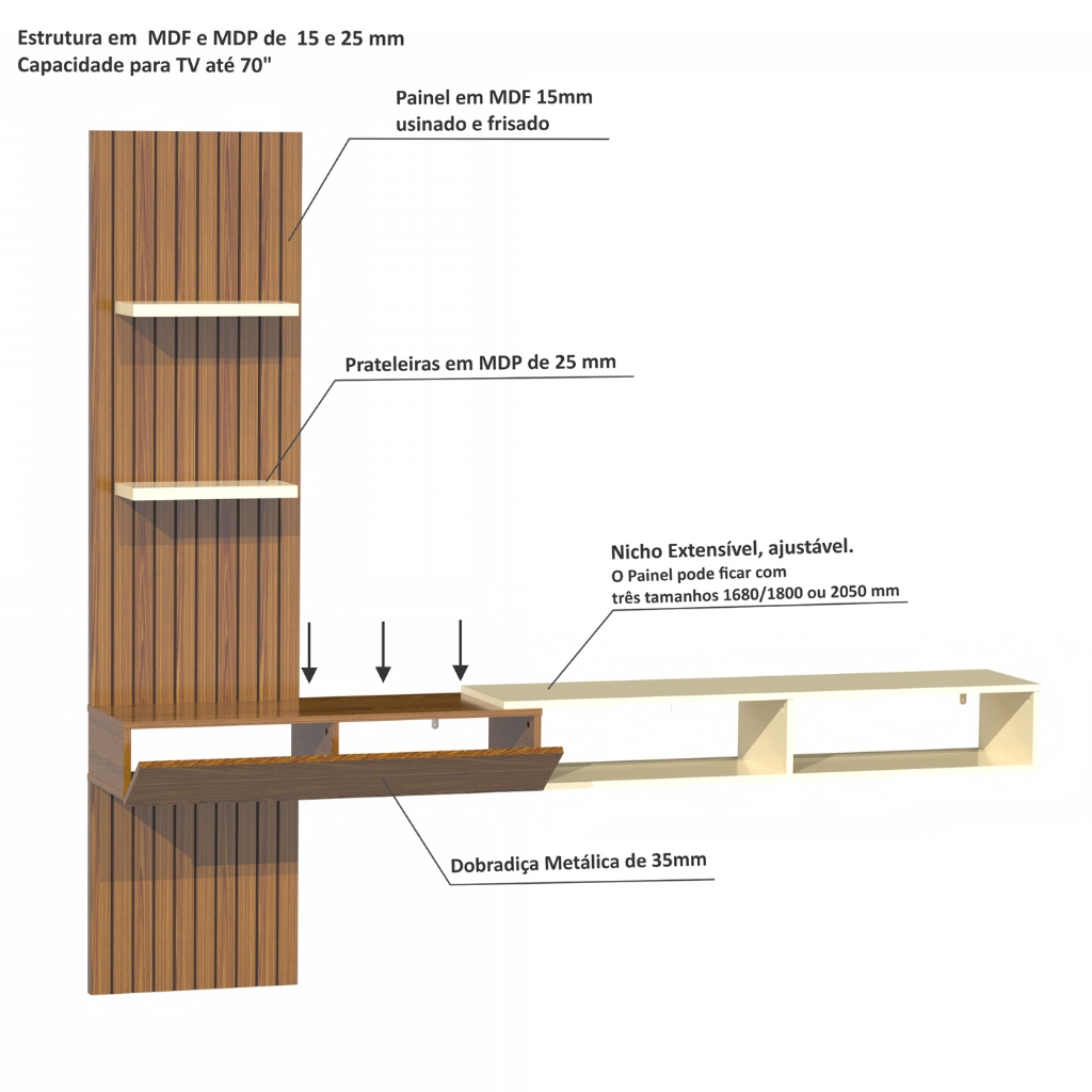 Painel Ripado p/Tv até 70” Nicho e Porta Basculante-FLEX –1,60mt, 1,80mt e 2,00mt-Ripado Ambos Lados