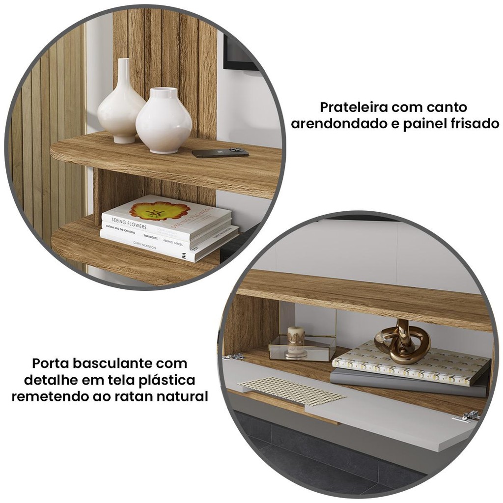 Apresentamos o Painel Jeri perfeito para complementar a decoração da sua sala. Com um design contemporâneo e uma base resistente para a tela plana, este painel suspenso é a escolha perfeita para aprimorar a decoração da sua sala de estar, enquanto mantém tudo organizado e acessível. Adicione um toque de elegância ao seu ambiente com este painel de alta qualidade. Material da estrutura: Estruturado em MDP 12mm; Tampo, Base, Laterias, Divisórias me Porta em MDP 15mm; Prateleira Superior MDP de 25mm e Painel Frisado em MDF 12mm; Dimensões: 160 cm(L) x 136 cm(A) x 32,5 cm(P); Tamanho máximo de TV: até 65’ polegadas; Tamanho do espaço para TV: 90,8 cm x 160 cm; Suporte de TV incluso: Não; Iluminação: Não se aplica; Quantidade de portas: 01 basculante com tela plástica remetendo ao ratan natural (dobradiças metálicas); Quantidade de gavetas: Não se aplica; Quantidade de prateleiras: 01; Quantidade de nichos: Não se aplica; Peso suportado: até 50 kg distribuídos; Requer montagem: Sim (kit montagem incluso); Embalagem do envio: Papelão e plástico. Tonalidade das Cores: Off White: Brilho; Naturale: Semi-Brilho. Informações adicionais: - Os objetos que ambientam as fotos não acompanham o produto; - É de inteira responsabilidade do cliente a montagem do produto e/ou instalação, assim como possíveis irregularidades provenientes de manuseio inadequado; - Embora o produto acompanhe o manual de montagem, verifique a complexidade antes de decidir montá-lo sozinho, recomendamos que contrate um profissional de sua confiança; - Fique atento, nossas cores podem sofrer alterações dependendo do seu monitor; - ANTES DE MONTAR O SEU PRODUTO, verifique se há alguma peça danificada, caso esteja, prestaremos a devida assistência dentro do prazo da garantia.
