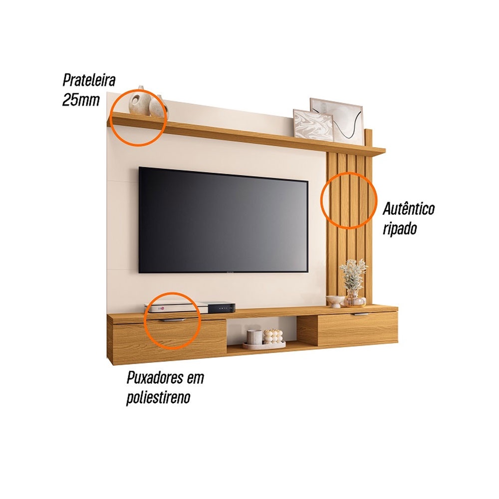Procurando por uma solução moderna e funcional para a sua sala de estar? Com espaço para TV de até 55 polegadas o Painel Suspenso Lets é a escolha perfeita. Ele conta com duas portas basculantes com puxadores em poliestireno, nicho central e prateleira superior em MDP de 25mm proporcionando funcionalidade na distribuição de objetos e decorações. O charme fica por conta de seu ripado lateral, que traz para si um visual clean e elegante. Produzido em MDP e MDF com espessuras de 25mm, 15mm e 12mm, este painel combina funcionalidade, resistência e beleza em uma única peça. Seu formato compacto se ajusta perfeitamente nos mais diversos tipos de ambiente. Com o Painel Suspenso Lets, você terá um móvel elegante, prático e funcional que vai deixar a sua sala de estar mais organizada e sofisticada. Características: Painel Marca: HB Móveis Modelo: LETS 3390 Material de Fabricação: MDF e MDP de 25mm/15mm/12mm Acomoda Tvs de até: 55 Polegadas Peso Máximo Suportado: 30Kg Distribuídos Quantidade de Portas: 02 Tipo de Porta: Basculante Quantidade de Prateleiras: 01 Estrutura das Prateleiras: MDP 25mm Material dos Puxadores: Poliestireno com Acabamento Metálico Fosco Possui Corrediças: Não Possui Pés e Rodízios: Não Material das Dobradiças: Metálicas Acabamentos: Peças na Cor Cinamomo com Acabamento em Impressão UV Texturizada Acabamento: Peças Off White Em Impressão UV Alto Brilho Conteúdo da Embalagem: 01 Painel Suspenso LETS 3390 HB Moveis Dimensões: Altura: 135 cm Largura: 160 cm Profundidade: 30,5 cm Peso: 42 Kg Garantia do Fabricante: 03 meses. Observações !!! As imagens são meramente ilustrativas Os objetos decorativos não estão inclusos Produto Necessita Montagem Não nos responsabilizamos pela montagem ou instalação do produto Sistema de Montagem: Girofix, Cavilhas, Buchas e Parafusos Entregamos até a porta de entrada da casa do cliente ou até a portaria do condomínio O produto chegara em sua casa devidamente embalado portando 01 volume Recomendações de Manutenção: Limpeza com Pano Macio Levemente Umedecido em Água.