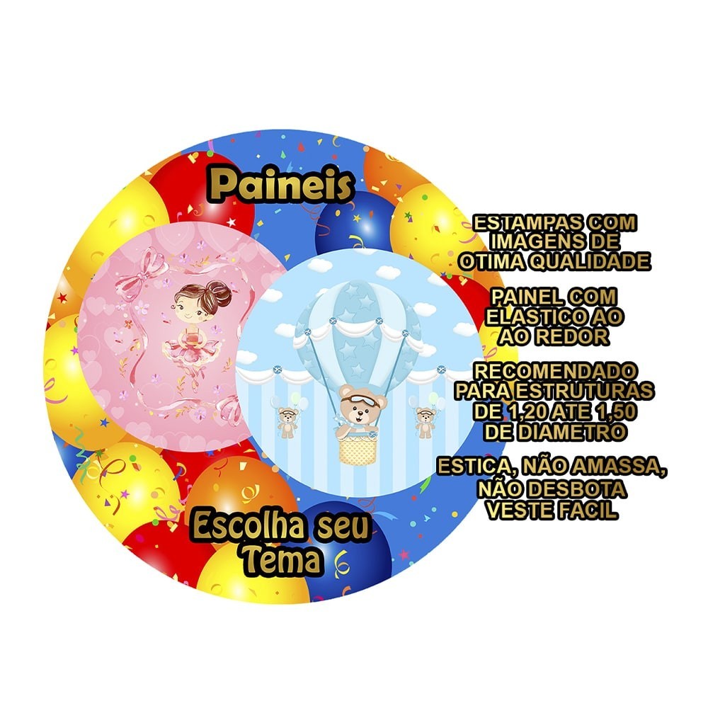 ATENCAO: NAO FAZEMOS AJUSTES DE MEDIDA OU ARTE NAS CAPAS DE CILINDRO DESTE ANUNCIO. VERIFIQUE AS MEDIDAS ANTES DE FINALIZAR A COMPRA *** ATENCAO : NAO ACOMPANHA ESTRUTURA/SUPORTE, VENDEMOS SOMENTE AS CAPAS EM TECIDO, SISTEMA VESTE FACIL!!! PAINEL REDONDO EM TECIDO COM ACABAMENTO EM ELASTICO <<< UTILIZACAO EM ESTRUTURAS CIRCULARES ENTRE 1,20 ATE 1,50 DE DIAMETRO. PAINEL NAO POSSUI EMENDA!!! Agora sua festa esta completa!!! Gracas aos Paineis Redondos em Tecido, voce ja conhece nossa qualidade na confeccao dos paineis de festa e tambem podera contar com a gente nas capas de paineis em tecido sublimado da sua decoracao. DETALHES DOS PAINEIS REDONDOS EM TECIDO: Tecido Malha New (Que estica e nao amassa). Tecido Leve com otimo caimento Gramatura: 140g/m de excelente qualidade. Composicao do Tecido: 95% Poliester e 5% de Elastano. Elastico cuidadosamente costurado na base ao redor do painel. Acabamento em overloque evitando que o Painel desfie. BENEFICIOS DAS CAPAS DE PAINEIS REDONDOS : Sistema "Veste Facil". Agilidade na instalacao Cores vivas que nao desbotam Sua decoracao fica pronta em poucos minutos Estica e nao amassa. Pode ser lavado quantas vezes for necessario Nao reflete luz, por ser feito em tecido.