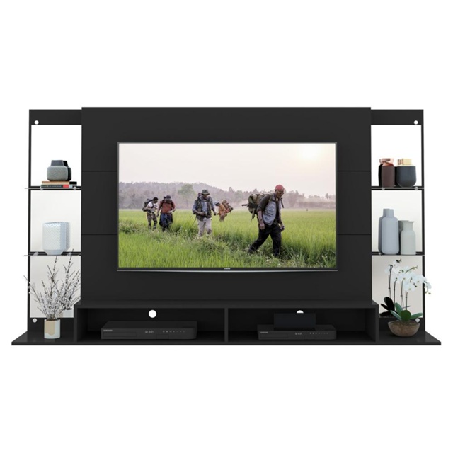 Painel TV 60" c/ suporte, espelho e prateleiras vidro Nairóbi Multimóveis Preto