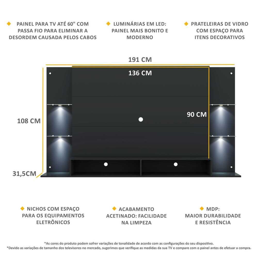 O Painel TV 60" com 4 Leds e Prateleiras de Vidro Vegas Multimóveis é produzido em MDP, que garante maior durabilidade, resistência e facilidade na limpeza. As luminárias em LED, que acompanham o painel, proporcionam um visual mais bonito e moderno, deixando o ambiente aconchegante para você curtir os melhores filmes e séries. Com design minimalista e de fácil instalação você pode escolher em qual lugar do móvel deseja fixar. Com luz brilhante, as luminárias funcionam com 3 pilhas AAA. O painel para TV de até 60” (suporta até 28 Kg) com espaçamento para a passagem dos fios, que deixa o visual clean e os cabos organizados conta, ainda, com 4 prateleiras em vidro para você decorar o ambiente com sofisticação e elegância e 2 nichos para acomodar os equipamentos eletrônicos. Uma escolha inteligente e super em conta para deixar sua sala mais bonita e confortável. Conteúdo da Embalagem: 1 (um) Painel para TV 1 (um) Kit com 4 Prateleiras de Vidro 1 (um) Kit com 4 Luminárias LED Dimensões do produto montado: Altura: 108 cm | Largura: 191 cm | Profundidade: 31,5 cm Tamanho Painel TV: 136 x 90cm *Devido as variações de tamanho dos televisores no mercado, sugerimos que verifique as medidas da sua TV e compare com o painel antes de efetuar a compra. *Você pode consultar as medidas internas na imagem técnica do produto. Disponível em 4 opções de cores: Madeirado - Branco - Preto Texturizado - Rustic *As cores do produto podem sofrer variações de tonalidade de acordo com as configurações do seu dispositivo. Imagem meramente ilustrativa. Decoração e eletros não acompanham o produto. O produto será entregue desmontado e não disponibilizamos o serviço de montagem.