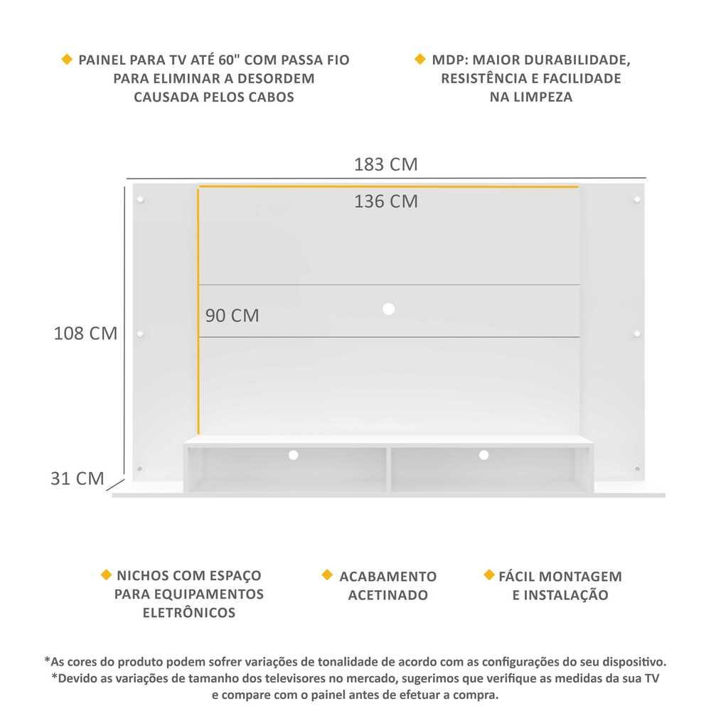 O Painel TV até 60 polegadas Tókio Multimóveis vai deixar sua sala de estar mais bonita e confortável para assistir seus programas e séries favoritos. Produzido em MDP com acabamento acetinado (cerca de 20% de brilho), que torna o móvel mais durável e resistente, o painel para TV de até 60 possui espaçamento para a passagem dos fios, o que deixa um visual clean e os cabos organizados, além de 2 nichos para acomodar os principais equipamentos eletrônicos e, o melhor: é super fácil de montar. Conteúdo da Embalagem: 1 (um) painel para TV Dimensões do produto montado: Altura: 108cm | Largura: 183cm | Profundidade: 31cm Tamanho Painel TV: 136 x 90cm *Devido as variações de tamanho dos televisores no mercado, sugerimos que verifique as medidas da sua TV e compare com o painel antes de efetuar a compra. *Não recomendamos utilizar suporte de TV articulado. *Você pode consultar as medidas internas na imagem técnica do produto. Disponível nas cores: Madeirado - Branco - Preto Texturizado *As cores do produto podem sofrer variações de tonalidade de acordo com as configurações do seu dispositivo. Imagem meramente ilustrativa. Decoração e eletros não acompanham o produto. O produto será entregue desmontado e não disponibilizamos o serviço de montagem.