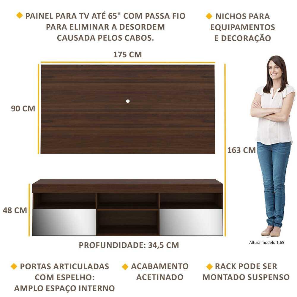 A sala de estar é o melhor lugar para receber a família e amigos, por isso ter um ambiente bonito e aconchegante é fundamental. O Painel TV até 65 polegadas com Rack Suspenso e Espelho Flórida Multimóveis é uma ótima opção para aproveitar seu espaço de maneira inteligente. Produzido em MDP com acabamento acetinado, que garante maior durabilidade e facilidade na limpeza, o rack possui nichos com espaço para os equipamentos eletrônicos, duas portas articuladas com espelho e um amplo espaço interno para manter seus pertences organizados. Os espelhos de vidro (evita que a imagem fique distorcida) e lapidados (passam por um processo para que as bordas não fiquem cortantes), são removíveis, já que são fixados com fita dupla face. O rack ainda acompanha kit para ser montado de forma suspensa, conforme a altura que você desejar do chão. O painel para TV de até 65” possui espaçamento para passagem dos fios, que permite deixar os cabos mais organizados e um visual clean. Conteúdo da Embalagem: 1 (um) rack com painel para TV 1 (um) kit com suporte para rack 1 (um) kit com 02 espelhos Dimensões do produto montado: Painel - Altura: 90cm | Largura: 175cm | Profundidade: 2,5cm Rack - Altura: 48cm | Largura: 175cm | Profundidade: 34,5cm *Devido as variações de tamanho dos televisores no mercado, sugerimos que verifique as medidas da sua TV e compare com o painel antes de efetuar a compra. *Você pode consultar as medidas internas na imagem técnica do produto. *As cores do produto podem sofrer variações de tonalidade de acordo com as configurações do seu dispositivo. Imagem meramente ilustrativa. Decoração e eletros não acompanham o produto. O produto será entregue desmontado e não disponibilizamos o serviço de montagem.