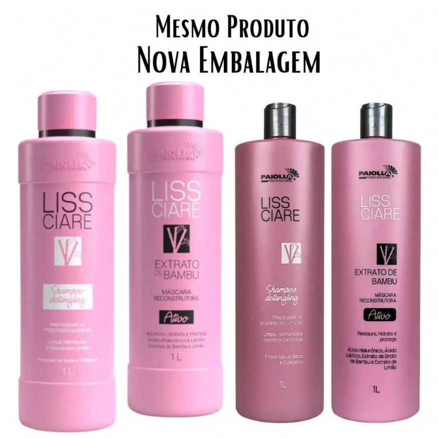 Paiolla Kit Tratamento Extrato de Bambu + Aplicação + Óleo + BB Care Cabelos rebeldes, volumosos e com frizz podem ser um grande desafio no dia a dia. O Kit Paiolla Tratamento Extrato de Bambu foi desenvolvido para resolver esse problema de forma prática e duradoura, proporcionando alisamento natural, nutrição intensa e proteção térmica em um único tratamento. O que acompanha o kit: - 01 Máscara Reconstrutora Liss Ciare Bambu 1L - 01 Shampoo Detangling Bambu 1L - Óleo - BB Care Benefícios do Tratamento Paiolla: - Liso 100% natural e sem frizz – disciplina até os fios mais rebeldes. - Resultados duradouros – mantém o cabelo alinhado e saudável por mais tempo. - Hidratação profunda – fórmula enriquecida com vitaminas A, B e C, aminoácidos e extrato de bambu. - Fácil aplicação – sem fumaça, sem ardência e com acabamento profissional. - Proteção térmica e brilho intenso – com o Fluído Fada Madrinha e Vinagre Capilar que selam as cutículas e prolongam o efeito do tratamento. Por que escolher o Kit Paiolla? - Substitui químicas agressivas por uma fórmula nutritiva e segura, que reconstrói os fios enquanto alisa. - Resolve problemas comuns como ressecamento, frizz, falta de brilho e dificuldade de modelagem. - Pode ser usado em casa ou no salão, com resultado de cabelo liso, leve e hidratado. Como aplicar: - Lave os cabelos 2x com o Shampoo Detangling Bambu e enxágue bem. - Seque cerca de 80% dos fios. - Aplique a Máscara Liss Ciare Bambu mecha a mecha, mantendo 3 cm da raiz. - Deixe agir de 30 a 90 minutos (dependendo do tipo de cabelo). - Retire o produto, seque 100% e pranche em mechas finas a 200–210ºC. - Lave novamente com o Shampoo Detangling, aplique uma máscara hidratante Paiolla e finalize. Precauções: - Em caso de contato com os olhos, enxágue imediatamente. - Se houver irritação, suspenda o uso. - Não ingerir. - Manter fora do alcance de crianças. Incompatibilidade: - Não utilizar em cabelos tratados com Hidróxido de Sódio, Lítio, Tioglicolato de Amônia, Guanidina ou Henê Rená.