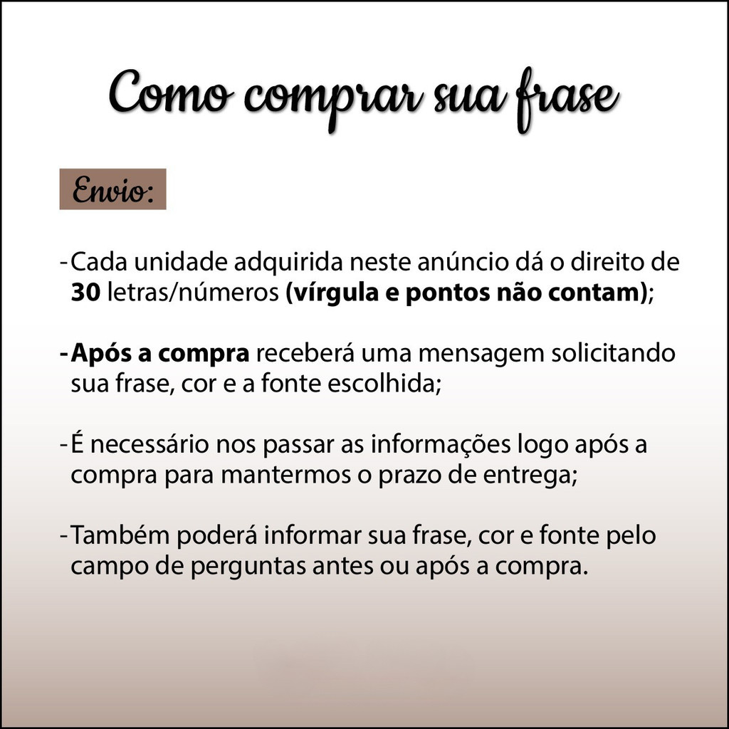 Transforme seu espaço com nomes, palavras inspiradoras ou aquela frase que você ama, peças lindas que combinam elegância e sofisticação. O design 3D do letreiro proporciona um efeito visual impactante, destacando sua frase de forma luxuosa. Escolha a cor que melhor se adapta ao seu ambiente e crie uma identidade visual marcante que impressionará seus visitantes. Fazemos qualquer frase ou palavras aleatórias (valor para ATÉ 30 LETRAS E UMA FIGURA, nos consulte para mais letras) TAMANHO: ALTURA - Média de 8 a 11cm, depende da fonte e frase escolhida LARGURA - Segue abaixo uma MÉDIA de largura/comprimento conforme a possível quantidade de letras 15 letras - aproximadamente 70cm 20 letras - aproximadamente 90cm 30 letras - aproximadamente 140cm *Medidas para frase em uma única linha, mas poderá dividir e instalar em várias linhas. FONTES DISPONÍVEIS: Disponibilizamos 5 modelos de letras para escolha, confira nas imagens do anúncio as opções. COMO COMPRAR E INFORMAR A SUA FRASE *Cada unidade adquirida neste anúncio dá o direito de 30 letras/numeros e uma figura, (vírgula e pontos não contam). *Após a compra receberá uma mensagem solicitando sua frase, cor e a fonte escolhida. *É necessário nos passar as informações logo após a compra para mantermos o prazo de entrega. *Também poderá informar sua frase, cor e fonte pelo campo de perguntas antes ou após a compra. INFORMAÇÕES GERAIS: *Corte a laser proporcionando acabamento perfeito e precisão *Cada palavra é uma peça separada, pode ser instalado na posição que desejar *Poderá escolher uma figura entre as opções mostrada na foto *As palavras são vazadas (oque se vê branco será a superfície aonde irá instalar) INSTALAÇÃO: *Instalação fácil, rápida e sem sujeira *Acompanha Fita dupla face para fixação ( essa Vai atrás do acrílico ) *Aplicar em superfícies retas e lisas, sem poeira e umidade