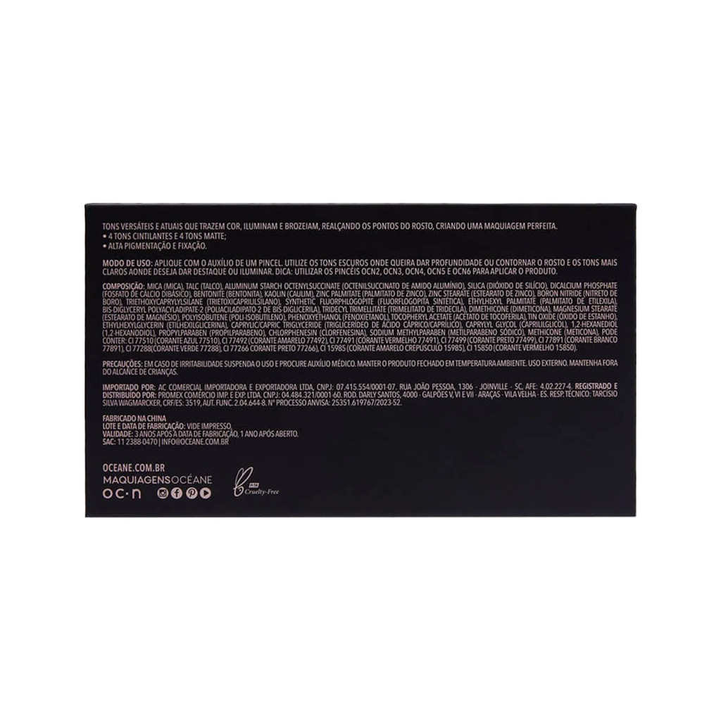 Descrição: A Paleta Multifuncional Oceane Edition Face Palette oferece várias possibilidades para a sua make, seja para o dia a dia ou para um evento em que você quer arrasar. Ela tem cores lindíssimas e sofisticadas que se adaptam a cada ocasião. Tonalidades matte: - Cool Peach é um blush coral lindíssimo, que confere um visual mais quente; - Fresh também funciona como blush, com uma pegada mais delicada na cor rosa clara; - Lite é recomendado para fazer contornos e deixar o rosto mais definido; - Bitten é super versátil e pode ser usado tanto como contorno quanto bronzer. Tons Cintilantes: - Gleam é um iluminador dourado que realça sua sofisticação; - Pink Dune também pode ser utilizado como iluminador, mas sua luminosidade é mais delicada com sua coloração rosada; - Golden Copper tem um acabamento acetinado incrível para ser usado como bronzer; - Brick Berry promove um look impactante e moderno com sua colocação rosa magenta ao ser utilizado como blush. MODO DE USAR: Como posso usar os tons matte? Eles são super versáteis e podem ser utilizados como blush, contorno, sombra ou bronzer, tornando mais prática e dinâmica a sua rotina de beleza. Cada um deles pode ser utilizado sozinho ou por baixo de outros produtos, para dar base para uma make mais elaborada, criando um resultado surpreendente para a sua produção. Como posso usar os tons cintilantes? Ideais para deixar a sua make mais iluminada e vibrante, eles podem ser utilizados como iluminador, bronzer ou blush, conferindo versatilidade na composição do seu look. Uma variedade incrível de cores para os mais diferentes tipos de make, tornando qualquer ocasião um grande acontecimento! USO EXTERNO. MANTENHA FORA DO ALCANCE DAS CRIANÇAS. Conteúdo da embalagem: 30.5g. Composição: mica (mica), talc (talco), aluminum starch octenylsuccinate (octenilsuccinato de amido alumínio), silica (dióxido de silício), dicalcium phosphate (fosfato de cálcio dibásico), bentonite (bentonita), kaolin (caulim), zinc palmitate (palmitato de zinco), zinc stearate (estearato de zinco), boron nitride (nitreto de boro), triethoxycaprylylsilane (trietoxicaprililsilano), synthetic fluorphlogopite (fluorflogopita sintética), ethylhexyl palmitate (palmitato de etilexila), bis-diglyceryl polyacyladipate-2 (poliaciladipato-2 de bis-diglicerila), tridecyl trimellitate (trimelitato de tridecila), dimethicone (dimeticona), magnesium stearate (estearato de magnésio), polyisobutene (poli-isobutileno), phenoxyethanol (fenoxietanol), tocopheryl acetate (acetato de tocoferila), tin oxide (óxido de estanho), ethylhexylglycerin (etilhexilglicerina), caprylic/capric triglyceride (triglicerídeo de ácido cáprico/caprílico), caprylyl glycol (caprililglicol), 1,2-hexanediol (1,2-hexanodiol), propylparaben (propilparabeno), chlorphenesin (clorfenesina), sodium methylparaben (metilparabeno sódico), methicone (meticona), pode conter: ci 77510 (corante azul 77510), ci 77492 (corante amarelo 77492), ci 77491 (corante vermelho 77491), ci 77499 (corante preto 77499), ci 77891 (corante branco 77891), ci 77288(corante verde 77288), ci 77266 corante preto 77266), ci 15985 (corante amarelo crepúsculo 15985), ci 15850 (corante vermelho 15850). #Imagem ilustrativa. Cor do produto poderá variar dependendo da configuração do monitor ou celular.