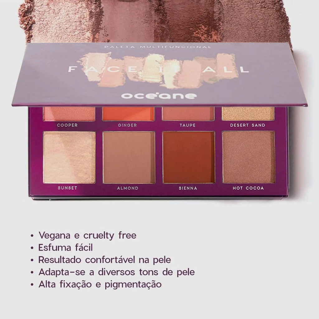 Descrição: A Paleta Multifuncional Face It All Oceane possui tons para contorno, blush e iluminador, tudo em uma única paleta de maquiagem. Em um único produto, você encontrará 8 tonalidades e texturas diferentes para cumprir com diversas funções: tem iluminador, blush, bronzer e contorno - este último, uma grande novidade da linha, sendo o primeiro contorno da collab com a influenciadora Mariana Saad. Os tons são super versáteis e atuais, eles trazem cor, iluminam e bronzeiam, realçando os pontos e criando uma maquiagem perfeita. São 4 cores cintilantes e 4 matte, com bastante fixação e muita pigmentação. Além disso, o estojo é muito prático, daqueles para levar na mala ou onde for e se resolver com um produto multifuncional. Sobre as cores: - Cooper - rosa cintilante - Ginger - alaranjado matte - Taupe - terracota matte - Desert sand - dourado cintilante - Sunset - champagne cintilante - Almond - marrom frio matte - Sienna - marrom quente matte - Hot cocoa - bronze cintilante MODO DE USAR: 1 - Aplique com o auxílio de um pincel. Utilize os tons escuros onde queira dar profundidade ou contornar o rosto, os tons mais claros onde deseja dar destaque ou iluminar e os tons rosados/avermelhados para dar uma aparência de saúde, ressaltando as maçãs do rosto. USO EXTERNO. MANTENHA FORA DO ALCANCE DAS CRIANÇAS. Conteúdo da embalagem: 25,6g. Composição: Silica (Dióxido De Silício), Mica (Mica), Talc (Talco), Kaolin (Caulim), Synthetic Fluorphlogopite (Fluorflogopita Sintética), Aluminum Starch Octenylsuccinate (Amidoctenilsuccinato De Alumínio), Boron Nitride (Nitreto De Boro), Tin Oxide (Óxido De Estanho), Triethoxycaprylylsilane (Trietoxicaprililsilano), Ethylhexyl Palmitate (Palmitato De Etilexila), Bis-Diglyceryl Polyacyladipate-2 (Trimelitato De Tridecila), Tridecyl Trimellitate (Bis-Digliceril Poliaciladipato-2), Dimethicone (Dimeticona), Magnesium Stearate (Estearato De Magnésio), Polyisobutene (Poli-Isobutileno), Phenoxyethanol (Fenoxietanol), Tocopheryl Acetate (Acetato De Dextroalfatocoferol), Propylparaben (Propilparabeno), Ethylhexylglycerin (Etilhexilglicerina), Sodium Methylparaben (Metilparabeno Sódico), Montmorillonite (Montmorilonita), Pode Conter: Ci15850 (Vermelho 57), Ci77492 (Óxido De Ferro Amarelo), Ci77891 (Dióxido De Titânio), Ci 77499 (Óxido De Ferro Preto), Ci77491 (Óxido De Ferro Vermelho), Ci 45410 (Vermelho Ácido 92). #Imagem ilustrativa. Cor do produto poderá variar dependendo da configuração do monitor ou celular.