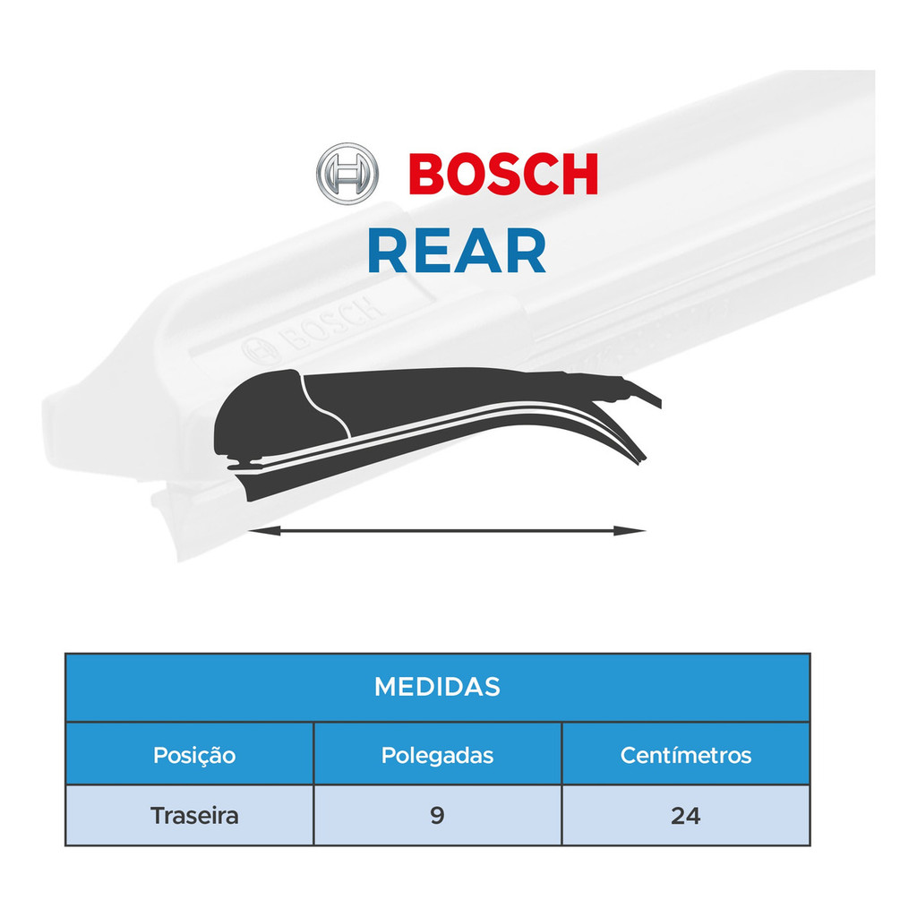Palheta Traseira Limpador Vidro Vigia REAR Original Bosch Chevrolet Spin 2012 A 2019 A alta performance ficou ainda melhor. Palhetas que garantem mais Eficiência, Segurança, Durabilidade e Qualidade. Se é BOSCH, pode confiar. Enxergue o que vem pela frente. Composto por: - 1 Palheta traseira Original Bosch Rear H240 Medida: - Palheta Traseira: 9" (24 cm) Compatível com: - Chevrolet Spin 2012 a 2019 Características: - Palheta traseira Original Bosch Rear - Instalação mais fácil e segura. - Maior durabilidade e eficiência comprovadas. - Sem partes metálicas expostas. Livre de desgastes de pintura e corrosão. - Spoiler aerodinâmico para ter uma distribuição uniforme de força, mantendo a varredura eficiente mesmo em altas velocidades. - Maior estabilidade em todas as situações de uso. - Funcionamento ultra suave, devido ao seu tratamento de grafite, para um movimento sem ruídos ou trepidações. - Nova embalagem moderna e atrativa. Perguntas Frequentes: Quando devo trocar as Palhetas do meu carro? - A troca deve ser realizada aos primeiros sinais de desgaste nas Palhetas. Isso porque o componente com desgaste tem a eficiência comprometida e atrapalha a visibilidade. Quais os sinais de desgaste da palheta? - Os sinais de uma Palheta com desgaste são: a Palheta não retira todo o excesso de água, faz barulho durante o funcionamento, risca o parabrisa do carro, lâmina de borracha torta, quebrada ou ressecada. Qual o prazo para a substituição das Palhetas? - Substitua as Palhetas pelo menos uma vez por ano. As Palhetas são originais? - Sim. Somos fornecedores autorizados BOSCH. Todos os produtos são originais e acompanham Nota Fiscal. Observação: - Em caso dúvidas sobre o modelo correto da Palheta para o seu carro, faça uma pergunta na parte inferior do anúncio. Temos uma equipe especializada para tirar as suas dúvidas. - O limpador de parabrisa é um acessório obrigatório por lei (artigo 230, XIX, do CTB). O não funcionamento perfeito ou mau uso do mesmo, é caracterizado como infração grave, com direito a multa e retenção do veículo. Mantenha a sua família segura. Compre Palhetas Originais BOSCH Aerofit.