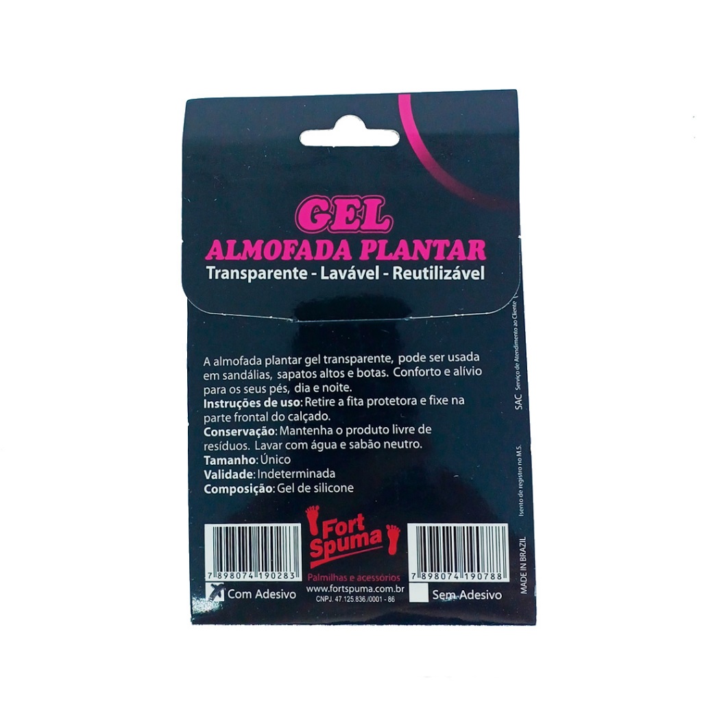 A almofada plantar em gel transparente, pode ser usada em sandálias rasteiras ou de salto. Escarpins ou botas. Aumentando o amortecimento do calçado e ajudando a melhorar o ajuste no caso de estar folgado em meio ponto. Possiu uma face lisa com autocolante protegido por um plastico a ser removido na aplicação. E a face superior com textura de bolinhas para melhorar a aderência nos pés. Possui formato ideal para acomodar a parte frontal dos pés Antes de instalar indicamos a limpeza do calçado com álcool para garantir que a palmilha tenha a melhor fixação possível Depois de instalada pode ser lavada com água e sabão neutro normalmente. Tamanho único de 9cm de comprimento por 6,5cm no ponto mais largo 2 a 3mm de espessura Composição: Gel de Silicone Observação: cada embalagem contém um par Produto ORIGINAL e com garantia. *Após comprar, não esqueça de avaliar nosso produto e nosso atendimento, seu feedback é muito importante para nós, com ele temos como medir onde manter a qualidade e onde melhorar*
