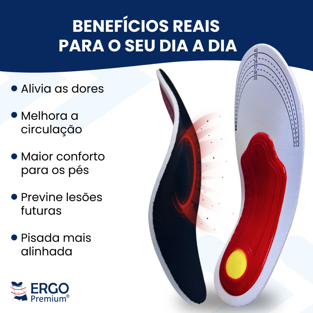 >>>Produto 100% ORIGINAL Ergo Premium®<<< ......................RECUSE IMITAÇÕES!......................... Palmilha Max Palm Correct – Ergo Premium® ORIGINAL **ATENÇÃO ESSE PREÇO PROMOCIONAL DE HOJE É VALIDO PARA O PAR** POR QUE USAR? Dores nos pés, joelhos, coluna e quadris podem ser causadas pelo tipo de pisada, especialmente no caso de pé chato. Isso resulta em má absorção do impacto e pode prejudicar sua saúde e postura. SOLUÇÃO: A Palmilha Max Palm Correct possui arco anatômico em fibra de carbono para corrigir o alinhamento dos pés e distribuir melhor o peso do corpo. Mais conforto, menos dores e prevenção de futuras lesões! BENEFÍCIOS: - Trata pé chato - Reduz e elimina dores - Melhora a postura - Previne lesões - Conforto anatômico para uso diário Tamanhos: 1 Par: 35 ao 40 1 Par: 41 ao 46 (Compre um número maior, pois a palmilha ajusta para menos) Palmilha Unissex | Garantia 7 dias Cuide dos seus pés e sinta a diferença no seu dia a dia!