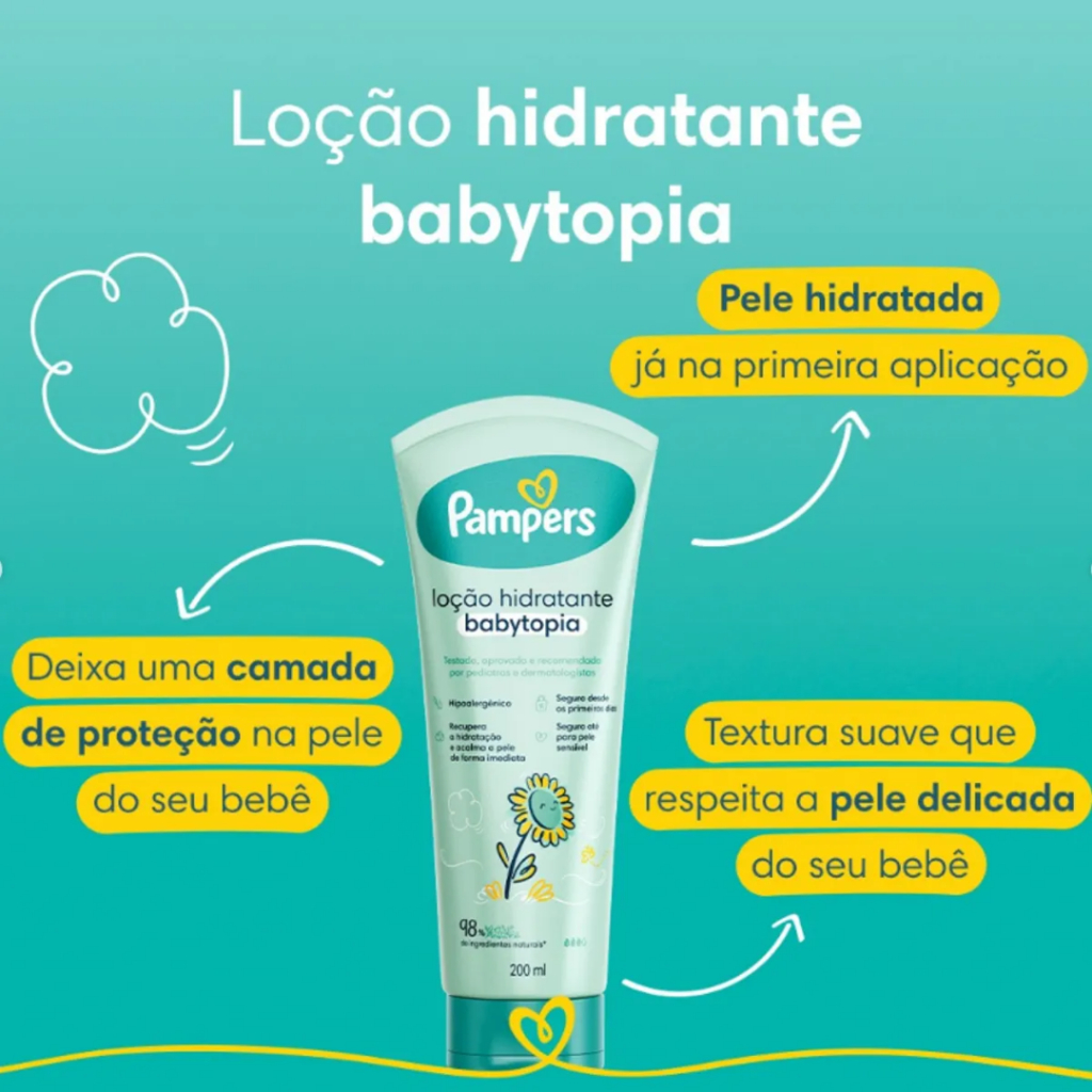 🍼✨ Pampers - Loção Hidratante Babytopia 200ml ✨👶 💛 Hidratação suave e carinho que dura o dia todo! A Loção Hidratante Pampers Babytopia foi desenvolvida especialmente para a pele delicada do bebê. Com textura leve, rápida absorção e uma fragrância suave e aconchegante, ela proporciona hidratação profunda e duradoura, sem deixar a pele oleosa. 🌿 Com ingredientes selecionados e dermatologicamente testada 💧 Nutre e protege contra o ressecamento 👶 Ideal para uso diário desde os primeiros dias de vida 🌸 Perfume delicado que transmite conforto e carinho 📦 Conteúdo: 200ml – rende muito! Perfeita para massagens relaxantes após o banho ou sempre que a pele do bebê precisar de um cuidado extra. Porque seu bebê merece o melhor desde o início! 💙 🛒 Adicione ao carrinho e cuide do seu pequeno com o toque suave de Pampers!