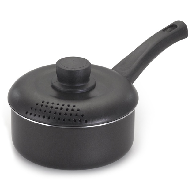 Panela Antiaderente Para Macarrão Instantâneo Alumínio Nacional 14 cm Este produto foi desenvolvido para facilitar o preparo do seu macarrão instantâneo, mas pode ser utilizado no preparo de outros alimentos. Essa panela é ideal para o seu dia-a-dia, pois é muito prática e fácil de limpar. E ainda possui furos na tampa para saída do vapor e também pode ser utilizada como escorredor de líquidos. Possui alças em baquelite que não aquecem, assim permite que a mesma seja manuseada confortavelmente no preparo do seu alimento. Essa panela tem um revestimento interno e externo de antiaderente ideal para quem gosta de praticidade, pois os alimentos não grudam na panela, proporcionando facilidade na limpeza do produto. Especificações Técnicas: Material: Alumínio \ Cabo de baquelite Cor: Preto Dimensões aproximadas: Altura: 6 cm Diâmetro: 14 cm Comprimento: 30 cm Capacidade: 0,9 litros