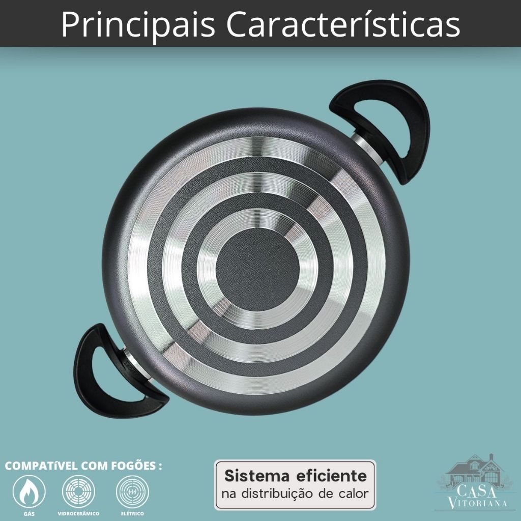 A escolha perfeita para quem busca eficiência, durabilidade, praticidade e beleza na cozinha! A Panela Caçarola 24 cm, é um item indispensável para a sua cozinha. Caçarola grande e lateral Alta, com Tampa de Vidro Temperado que possui saída de vapor e borda de aço inox, que proporciona a visualização do processo de cozimento dos alimentos. Esse item oferece uma experiência culinária completa! O grande diferencial está no seu material, Alumínio de alta qualidade, espessura de 1,1 mm que confere ao item uma estrutura resistente, garantindo a durabilidade mesmo com uso intenso. Com distribuição eficiente do calor promove um cozimento rápido e uniforme dos alimentos, proporcionando resultados incríveis em suas preparações. Revestimento interno e externo, com 5 Camadas de Antiaderente TEFLON (DuPont) - PFOA Free (livre de substâncias tóxicas - ausência de elementos nocivos à saúde). Essa superfície antiaderente eficaz evita que os alimentos grudem, facilitando o cozimento e a limpeza. Além disso, essa característica permite o preparo dos alimentos com menos gordura, promovendo uma alimentação mais saudável e prática. Cabo ergonômico reforçado feito em baquelite, material antitérmico que não retém calor, o que permite cozinhar com conforto e tranquilidade, evitando acidentes na cozinha. Aproveite! Adquira o seu e experimente uma nova forma de cozinhar. Esse item atende a diferentes usos, sendo do preparo dos alimentos ao serviço de mesa, do café da manhã ao jantar, do churrasco à mesa de queijos. Além de funcional, compõe a decoração com seu design moderno, agregando charme e sofisticação ao ambiente. Transforme suas refeições em momentos especiais! Conteúdo: Dimensões aproximadas - cm: (Altura x Largura x Comprimento – Capacidade volume): - 1 Caçarola 24 cm de diâmetro c/ tampa de vidro – 10,5 x 24 x 36 – 4,5 Litros - Material: Alumínio Revestimento Antiaderente Teflon - Externo - Cor: Grafite Preto - Interno - Cor: Grafite Preto - Espessura Material: 1,1mm - Cabo: Baquelite - Tampa: Vidro Temperado - Peso do Conjunto: 982 kg - Dimensões da Embalagem (AxLxC): 17,5 x 26,5 x 31 cm - Peso Embalagem - Caixa Parda: 148g Antes do primeiro uso: É imprescindível realizar a Limpeza e Cura do item, essencial para a proteção e durabilidade da camada antiaderente. Instruções: Lave o item, com esponja macia e detergente neutro, seque com um pano limpo. Unte a parte interna com óleo e leve ao fogo baixo por 2 minutos. Deixe esfriar, lave, enxugue e está pronta para utilizar. Cuidados e Recomendações: - Lave com detergente neutro e esponja macia; - Para secar, utilize um pano seco e macio; - Nunca utilize produtos solventes ou abrasivos; - Evite a imersão do produto quente em água fria, deixe esfriar antes de lavar; - Para mexer os alimentos use somente utensílios de silicone ou nylon; - Não pode ser levada ao forno e/ou micro-ondas; - Não exponha as alças e cabos diretamente ao fogo ou fonte de calor prolongado; - Mantenha o produto sobre a chama do fogão apenas o necessário para o cozimento, sempre em fogo baixo ou médio (nunca superior a 350°C). - Detalhes: - Itens decorativos não acompanham o produto. Imagens meramente ilustrativas; - Para descarte dos produtos e embalagens siga as orientações de reciclagem vigente; - Pode conter pequena variação na cor do produto dependendo das configurações da tela do seu computador ou smartphone. Agradecemos a sua visita e aguardamos seu pedido! É uma grande satisfação ter você como cliente. Estamos à disposição para qualquer dúvida. Atenciosamente, Equipe Casa Vitoriana
