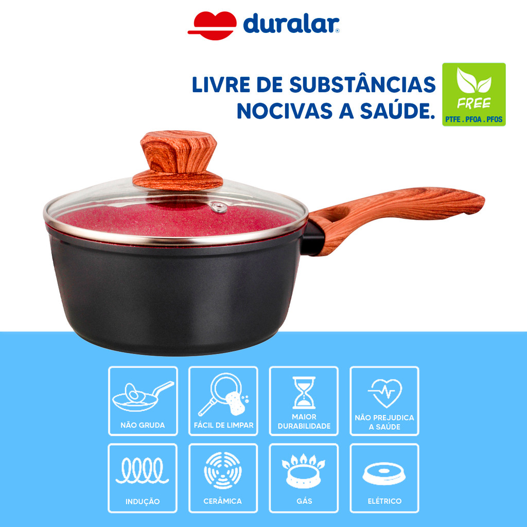 Panela Com Cabo Cerâmica Antiaderente Indução Red Marble N16 Duralar Compatível Com Todo Tipo de Fogão! Leve praticidade, saúde e sofisticação para sua cozinha com a Panela com cabo Duralar Red Marble N16. Com capacidade de 1,2 litros, ela é feita de alumínio forjado e conta com um revestimento nanocerâmico antiaderente, proporcionando um cozimento uniforme e saudável, ideal para receitas leves e nutritivas. Compatível com fogões de indução, a panela com cabo é prática e eficiente. Sobre a Linha de Produtos da Duralar: A marca Duralar se destaca no mercado por oferecer produtos com revestimento nanocerâmico premium, o mais avançado em tecnologia antiaderente. Esse revestimento de ponta garante uma distribuição de calor excepcional, permitindo que seus alimentos cozinhem de maneira uniforme e com menos óleo, preservando o sabor e a textura natural dos ingredientes. Além disso, a nanocerâmica facilita a limpeza, evitando que os alimentos grudem. Certificados pelo INMETRO, os produtos da Duralar combinam durabilidade e responsabilidade ambiental, utilizando materiais ecologicamente corretos e processos de fabricação sustentáveis. Especificações Técnicas: Material: Alumínio forjado 4.0 mm Diâmetro: 16 cm Capacidade: 1,2 litros Cor: Cinza com revestimento cerâmico vermelho Compatível com fogões de indução, a gás ou elétricos Tampa: Vidro temperado com saída de vapor Cabo: Tecnologia soft-touch, que não esquenta e proporciona um toque confortável e seguro Lavagem: Esponja macia e detergente, Lava louça pode diminuir a vida util do revestimento. Espere esfriar para lavar. Livre de substâncias tóxicas como PFOA e PTFE Benefícios: 5 Camadas: Revestimento antiaderente de altíssima resistência, camada protetora do antiaderente, alumínio forjado de 4 mm, pintura resistente a altas temperaturas e base de aço puro para indução. Cozimento saudável: O revestimento nanocerâmico permite o preparo de alimentos com menos óleo ou gordura, preservando o sabor e a textura dos alimentos. Durabilidade e resistência: O alumínio forjado oferece alta resistência à abrasão e longa durabilidade. Distribuição uniforme de calor: O design em alumínio forjado garante aquecimento rápido e uniforme, cozinhando seus alimentos de maneira eficiente. Fácil de limpar: O revestimento antiaderente facilita a limpeza. Segurança e sustentabilidade: Livre de PFOA e PTFE, é uma escolha saudável e ecológica para sua cozinha. Conforto no manuseio: O cabo e o pomel em tecnologia soft-touch garantem segurança e conforto ao cozinhar. Conteúdo da Embalagem: 1 Panela com cabo de Alumínio Duralar Red Marble N16 (1,2 litros) Adicione mais praticidade e qualidade às suas receitas com a Panela com cabo Duralar Red Marble N16. Garanta a sua agora e transforme sua cozinha com tecnologia e elegância! Se você busca uma panela de qualidade e altíssima durabilidade, a panela com cabo nanocerâmica marmorizada é a escolha perfeita para você!