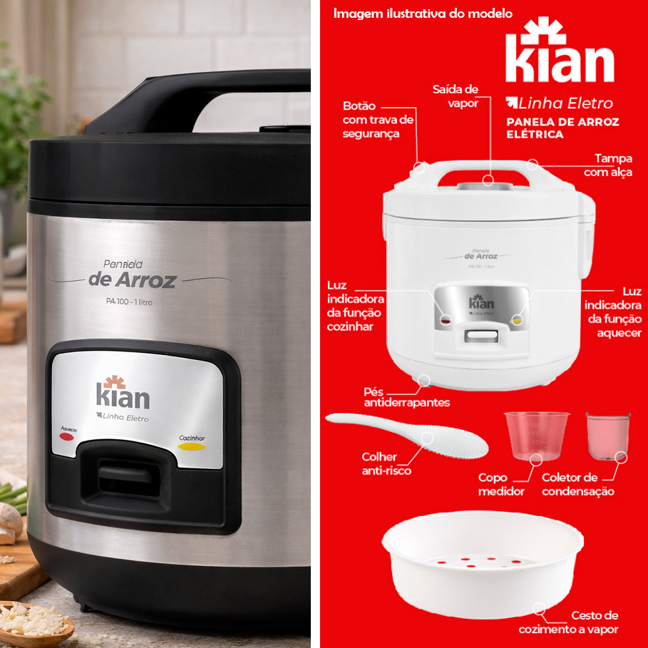 Panela de Arroz Elétrica Kian PA100 Inox 5 Xícaras- 127V Descrição Comercial A Panela de Arroz Elétrica Kian PA100 é ideal para quem busca praticidade e rapidez no preparo das refeições do dia a dia. Com capacidade para até 5 xícaras de arroz, ela é perfeita para pequenas famílias, proporcionando arroz soltinho e bem cozido com facilidade. Seu design em inox oferece um visual moderno que combina com qualquer cozinha, enquanto o funcionamento automático facilita o preparo: basta adicionar os ingredientes e ligar o aparelho. Após o cozimento, a panela muda automaticamente para a função de manter aquecido, ajudando a conservar o alimento na temperatura ideal até o momento de servir. Compacta e fácil de usar, a panela de arroz Kian é uma ótima aliada para preparar refeições com praticidade, garantindo resultados consistentes no preparo de arroz e outros alimentos. Características: - Capacidade para até 5 xícaras de arroz - Acabamento externo em inox - Funcionamento automático - Função cozinhar e manter aquecido - Tampa com saída de vapor - Recipiente interno removível - Estrutura compacta e prática - Ideal para preparo de arroz e receitas simples Benefícios: - Preparo de arroz de forma prática e rápida - Mantém o alimento aquecido após o preparo - Fácil operação com apenas um comando - Design moderno em inox - Recipiente removível que facilita a limpeza - Compacta, ocupa pouco espaço na cozinha Orientações de Uso: - Utilize a quantidade adequada de arroz e água conforme a receita - Não ultrapasse o limite máximo indicado no recipiente interno - Não mergulhe a base elétrica em água - Desligue da tomada antes de realizar a limpeza - Limpe o recipiente interno apenas após o resfriamento - Utilize o aparelho em superfície plana e estável Ficha Técnica: - Marca: Kian - Linha Comercial: Eletroportáteis - Modelo: PA100 - EAN: 7899710024436 - Cor: Inox / Preto - Tensão: 127V - Capacidade: 5 xícaras de arroz - Funções: Cozinhar / Manter aquecido - Tipo de panela: Panela elétrica de arroz - Material externo: Aço inox e plástico - Recipiente interno: Removível - Tampa: Com saída de vapor - Frequência: 60 Hz - Uso indicado: Doméstico - Altura aproximada: 23 cm - Largura aproximada: 23 cm - Comprimento aproximado: 23 cm - Peso aproximado: 1,6 kg Conteúdo da Embalagem: - 01 Panela de Arroz Elétrica Kian PA100 - 01 Copo medidor - 01 Colher para arroz - 01 Manual de instruções
