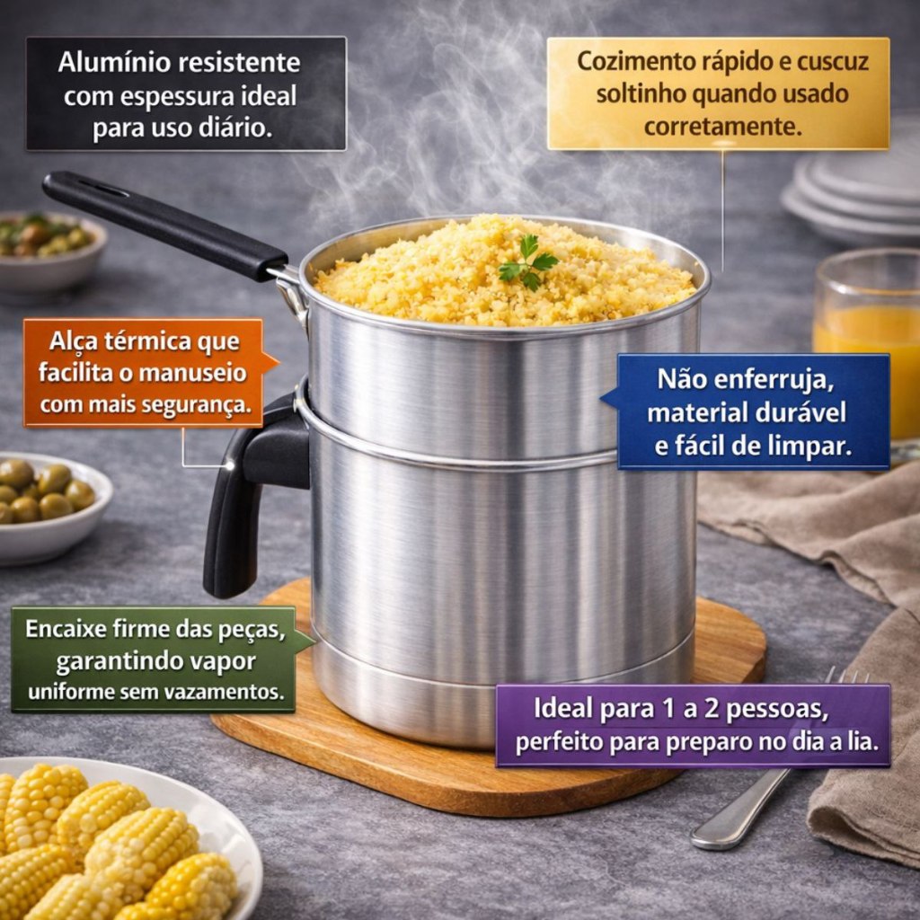 | Panela De Cuscuz 2 Em 1 Legumeira Cuscuzeiro Alumínio este produto | R$ 28,60 | 48% | 4.8/5 | 37 |