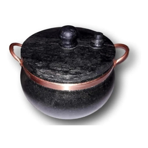 Panela de pedra com pressão 3lts com alça de cobre, curada pronta para uso. Cozinha carnes, feijão, mandioca é demais legumes, com segurança e sem alterar o sabor dos alimentos Pode ser destampada mesmo estando quente e fervendo que não terá perigo de explosão, fácil de lavar e decorativa