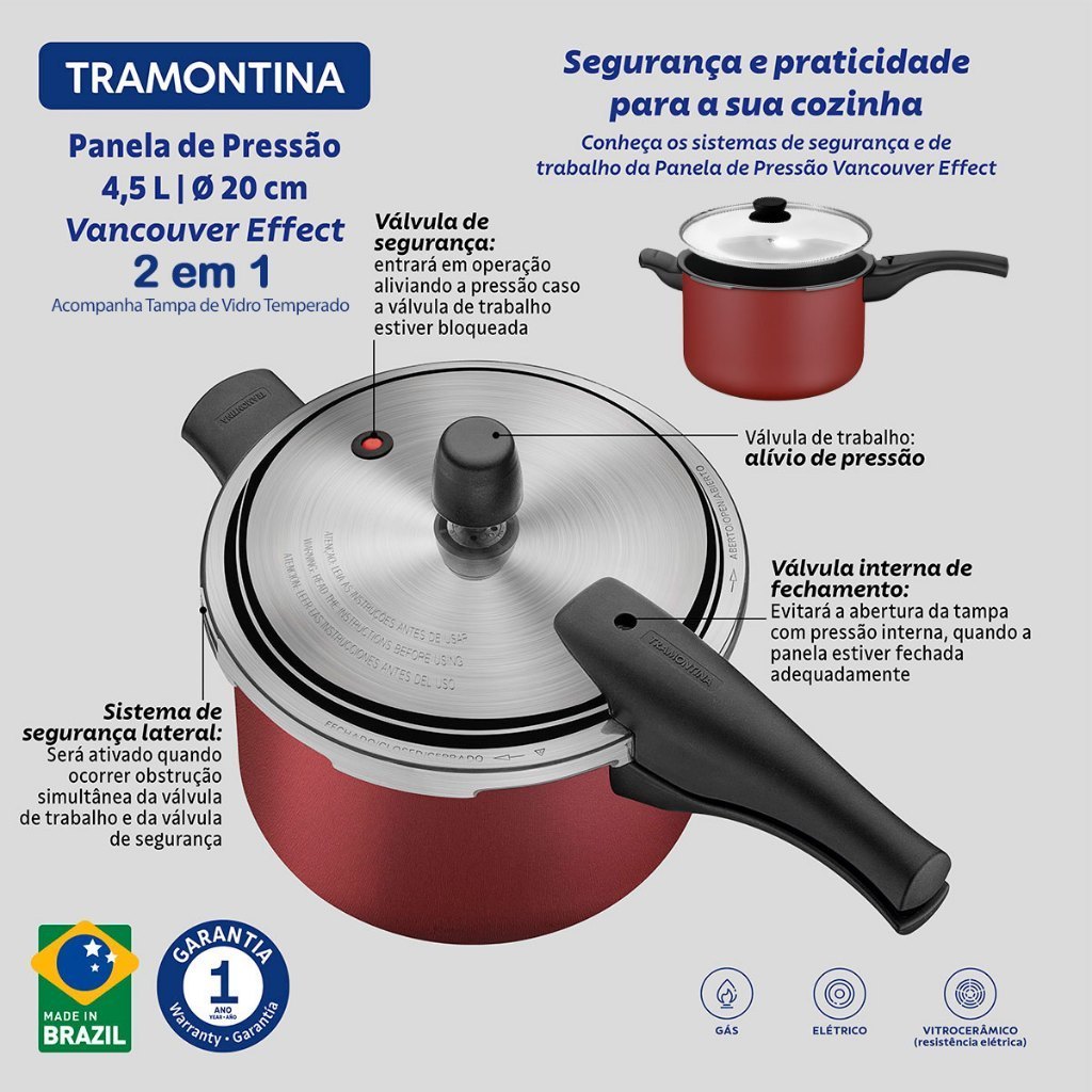 Descrição: Já pensou em ter em sua cozinha uma panela eficiente e versátil, segura e resistente, que além de colorida e linda, também, não grude os alimentos e ainda ofereça a função de panela sem pressão ? Pois, oferecemos a você a oportunidade de ter 2 Panelas em 1, com o Kit de panela de pressão Tramontina Vancouver com Tampa de vidro Temperado extra. A Estrutura da Vancouver é Feita em alumínio com revestimento interno e externo antiaderente Starflon Max vermelho, possui 20 centímetros de diâmetro e 4,5 litros! Com um lindo revestimento interno e externo em antiaderente Starflon Max na cor vermelha, ela será a estrela do seu fogão. Ela é produzida em alumínio com espessura de 3,2mm que proporciona o cozimento rápido e uniforme dos alimentos. Possui alça e cabos antitérmicos para facilitar o manuseio e conta com três válvulas de segurança que oferecem maior proteção durante o uso. Com certeza, a escolha perfeita para completar seu ambiente e ser a protagonista em sua cozinha, agora com 2 Funções! Características: - Corpo de alumínio com espessura de 3,2 mm que proporciona cozimento rápido e uniforme. - Com revestimento interno e externo de antiaderente Starflon Max que não gruda, é fácil de limpar, mais durável e não é prejudicial à saúde. - Tampa de alumínio com acabamento externo escovado e interno satinado. - Alça, cabos superior e inferior de baquelite antitérmico que oferecem segurança durante o manuseio. - Após atingir a pressão interna, reduza a intensidade da fonte de calor. - Pode ser utilizada nos fogões: gás, elétrico e vitrocerâmico - resistência elétrica. - Acompanha mais 1x Tampa de Vidro Temperado com saída a vapor Orientações de Uso: - Ao utilizar utensílios quentes tenha cuidado redobrado. - Se necessário, utilize proteção para as mãos e mantenha fora do alcance de crianças. - Para sua segurança, ao utilizar utensílios com cabos, mantenha os mesmos sempre voltados para o centro do fogão. - Ao utilizar seu utensílio em fogões com grade, mantenha a peça centralizada e alinhe o cabo com a grade, para reduzir o risco de queda. - Para descarte do produto e embalagem siga as orientações de reciclagem vigentes. Ficha Técnica: - Marca: Tramontina - Produto: Panela de Pressão 2 em 1 - Linha Comercial: Vancouver - Cód./Modelo: 20591720 - Código de Barras: 7891112344730 - Material: Alumínio - Baquelite - Cor: Vermelha - Revestimento: Antiaderente - Capacidade: 4,5 Litros - Tipos de Fogão: Gás - Elétrico - Vitrocerâmico - Espessura: 3,2mm - Dimensão: 408x231x229 mm - Peso: 2,02 kg Itens Adicionais: - A Tampa adicionada ao KIT não pertence à marca Tramontina, sendo em vidro temperado com orifício de respiro e de marca conforme a disponibilidade em estoque. Conteúdo: 01 Panela de Pressão Tramontina Vancouver em Alumínio Antiaderente Vermelha 4,5 Litros 01 Tampa de Vidro Temperado com Saída a Vapor ( Não pertence à marca Tramontina )
