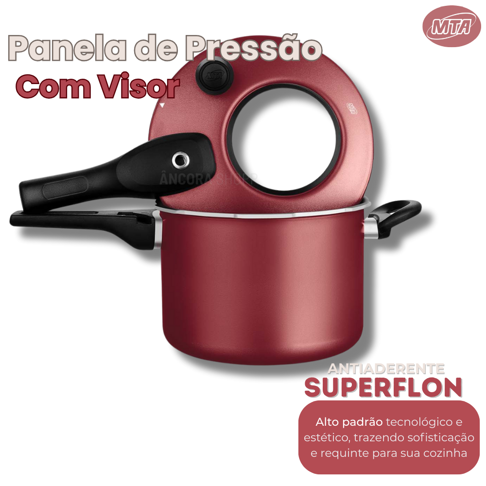 Panela de Pressão 4,5L com Visor – Antiaderente Vermelha Cereja MTA Cozinhe com mais segurança, praticidade e estilo! A Panela de Pressão MTA de 4,5 litros foi desenvolvida para quem busca rapidez no preparo, sem abrir mão de segurança e facilidade. Seu visor transparente permite acompanhar o cozimento sem precisar abrir a panela, garantindo mais confiança no dia a dia. O revestimento antiaderente de alta performance impede que os alimentos grudem, facilita a limpeza e proporciona um cozimento mais saudável. O fechamento externo oferece encaixe firme e seguro, enquanto sua estrutura resistente garante durabilidade para muitos anos de uso. Com design moderno na cor vermelha cereja, ela leva sofisticação à cozinha e otimiza a sua rotina com resultados rápidos, saborosos e com preservação dos nutrientes. Principais Benefícios Capacidade de 4,5 litros: ideal para famílias menores e uso diário. Visor transparente: acompanhe o cozimento sem abrir a panela. Antiaderente premium: não gruda e facilita a limpeza. Fechamento externo seguro: mais estabilidade e desempenho. Cor vermelha cereja: charme e modernidade para sua cozinha. Alta durabilidade: materiais resistentes e confiáveis. Cozimento rápido e eficiente: preserva sabor, textura e nutrientes. Fácil de limpar: manutenção simples e prática.