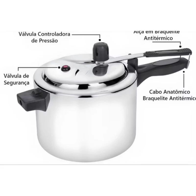 ****** ENVIO ****** • Envio imediato; • Produtos em estoque a pronta entrega. Panela De Pressão 7 Litros Um dos melhores aromas da cozinha é o cheiro de comida fresquinha, certo? As Panelas de Pressão da Alumínio Nacional te ajudam nesta tarefa! Com elas, você pode cozinhar um feijão fresquinho e muitas outras delícias de maneira rápida, eficiente e segura! Feita em alumínio, nossa panela de pressão possui três válvulas de segurança para sua total tranquilidade durante o uso, cabo e alça antitérmico para melhor manuseio e garantia de fábrica de 1 ano! Dimensões aproximadas: - Diâmetro: 20,1cm - Altura: 17cm - Capacidade: 7 litros - Marca: Roque Com Segurança e qualidade para dentro de sua casa. Com a Panela de Pressão de 7 Litros, você ganha tempo para um cozimento rápido e uniforme, sem perder o sabor da comida, além da praticidade e beleza. Com a panela de pressão de 7 Litros você pode cozinhar alimentos em altas temperaturas acima do ponto de ebulição (100 graus Celsius) da água à pressão ambiente, possibilitando portanto um tempo de cozimento reduzido. Qualidade com um ótimo custo benefício. Entre os diferenciais do produto estão o alumínio polido com alto brilho, alças ergonômicas e a segurança garantida pelo certificado do Inmetro. Acompanha alça para maior facilidade de uso e segurança. Capacidade da panela: 7 Litros Composição: Alumínio Polido ****** ESPECIFICAÇÕES TÉCNICAS DO PRODUTO ****** • Capacidade volumétrica de 7 Litros; • Pressão de trabalho de 70 kPa; • Liga de Alumínio certificada, espessura de 2,3 mm; • Acessórios de baquelite; • Guarnição (anel de vedação) e válvula de segurança em silicone; • Acabamento Polido; • Produto de qualidade. ****** CUIDADOS ANTES DO USO E CONSERVAÇÃO DO PRODUTO ****** • Remova a etiqueta e lave para retirar possíveis excessos de resíduos de fabricação; • Alimentos como sal. Alho e molho de tomate, quando ficam muito tempo em contato com o alimento podem ocasionar manchas e corrosão; • A limpeza e a substituição dos acessórios devem ser realizadas sempre que necessário. A troca desses acessórios deve ser feita por originais. *** SEGURANÇA NO USO DO PRODUTO *** • A quantidade de água e alimento juntos não podem ultrapassar 2/3 do dimensionamento da panela, pois o excesso poderá comprometer o funcionamento da válvula reguladora de pressão e de segurança; • Não deixe os cabos virados para fora do fogão; • A chama não deve ultrapassar a base da peça; • Utilize luvas térmicas no manuseio de utensílios quentes; • É recomendável o reaperto dos parafusos periodicamente; • Produto para uso doméstico em fogão a gás. *** GARANTIA *** • Garantia em casos de defeitos de fabricação. ** PRAZO DE ENTREGA E VALOR DO FRETE ** • O prazo de entrega varia de acordo com o CEP do destino; • Consultar o prazo de entrega e o valor do frete direto no link do produto. ** IMPORTANTE ** • Antes de comprar, certifique-se de que seus dados estejam corretos, pois serão com eles que concluiremos a venda; • Tire todas as dúvidas no campo de Perguntas e Respostas abaixo antes de finalizar a compra. SERÁ UM PRAZER ATENDE-LOS!!