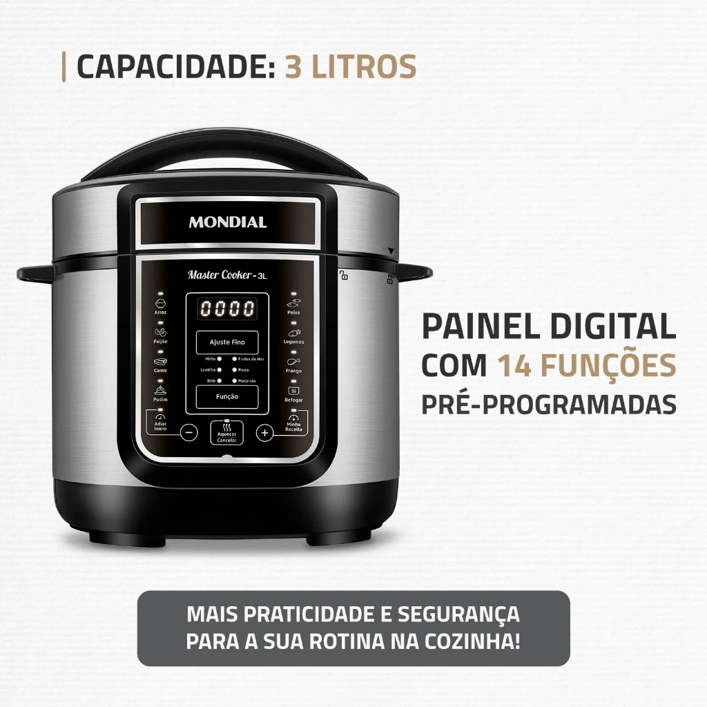 Panela de Pressão Elétrica Mondial Digital Master Cooker PE-40 Quem deveria comprar este produto? A Panela de Pressão Elétrica Digital Master Cooker PE-40 da Mondial é perfeita para quem busca praticidade e eficiência na cozinha. Ideal para quem quer preparar refeições rápidas e variadas, desde arroz, feijão e carnes até sopas e sobremesas, com segurança, versatilidade e tecnologia, sem abrir mão de sabor e qualidade. A Panela de Pressão Elétrica Digital Master Cooker 3L Mondial vai trazer muito mais praticidade dentro da cozinha. Possui painel digital com 14 receitas predefinidas, que inicia os preparos com apenas um clique! Você também tem a opção de programar o cozimento automático com até 24 horas de antecedência. Com capacidade de 3 litros, é ideal para o preparo de deliciosas receitas. Saiba mais sobre a PE-40 da Mondial: DISPLAY DIGITAL COM 14 FUNÇÕES PRÉ-PROGRAMADAS: Cozinhe de maneira fácil, inteligente e segura as suas melhores receitas. O painel digital facilita a escolha das receitas e tempo de preparo. CAPACIDADE DE 3 LITROS: Permite o preparo dos alimentos na quantidade ideal para cada ocasião. VERSATILIDADE DE RECEITAS: Você pode fazer carnes, arroz, feijão, peixes, sopas, legumes, pudim e muito mais! DESIGN SOFISTICADO: Em aço inox, o acabamento garante beleza para sua cozinha e mais durabilidade. VÁLVULA DE SEGURANÇA: Impede que a pressão interna ultrapasse o limite máximo. FUNÇÃO AQUECER: Desliga automaticamente e conserva o alimento quentinho por mais tempo. AJUSTE FINO: Você escolhe o tempo de preparo ideal para suas receitas. TIMER: Mais liberdade e comodidade, permitindo programar o funcionamento com até 24 horas de antecedência. CUBA ANTIADERENTE E REMOVÍVEL: O revestimento antiaderente evita que os alimentos grudem e facilita a limpeza. MAIS PRATICIDADE: A tampa ergonômica com travamento e alça, permite a utilização prática e segura, além de facilitar o transporte. COLETOR DE VAPOR: Recolhe a água condensada durante o funcionamento do produto. ACESSÓRIOS: Acompanha colher e copo medidor. UM ANO DE GARANTIA MONDIAL: A Mondial é a escolha de milhões de consumidores. Mondial, a escolha inteligente! INFORMAÇÕES TÉCNICAS - Modelo: PE-40 - Cor: Preto/Inox - Voltagem (Tensão): 220V - Itens inclusos: 01 Panela Elétrica - Manual de Instruções - Tipo de panela: Panela Elétrica de Pressão - Material: PP - Capacidade: 3L - Potência: 700W - Revestimento interno: Sim - Ação do produto: Cozinhar, refogar e praparar alimentos de forma mais rápida. - Luz indicadora: Display Digital - Acessório para cozimento a vapor: Não - Colher e copo medidor: Sim - Alimentação: Energia Elétrica -Garantia: 1 ano - Comprimento do cabo: 1,50m DIMENSÕES E PESO DO PRODUTO - 31,3cm x 29,8cm x 26,5cm (AxLxP) - 3,200kg