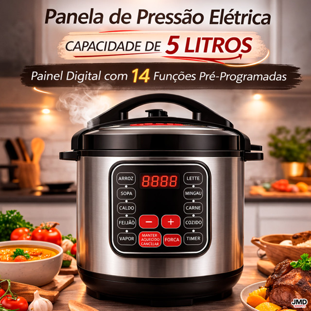 Descubra a praticidade e a eficiência da nossa panela de pressão elétrica! Com ela, você pode preparar refeições deliciosas de forma rápida e segura. Cozinhe feijão, carnes, legumes e muito mais em questão de minutos, poupando tempo e energia na cozinha. Seja você um cozinheiro experiente ou alguém em busca de mais praticidade no dia a dia, essa panela é o seu novo melhor amigo na cozinha. Aproveite já! -VOLTAGEM 127V OU 220V -PANELA DE 5 LITROS -PAINEL DIGITAL COM 13 FUNÇÕES -ACOMPANHA COPO, COLHER E MEDIDOR -FUNÇÃO TIMER -CUBA REMOVÍVEL E ANTIADERENTE -FUNÇÃO AQUECER -VÁLVULA DE SEGURANÇA -FUNÇÃO REFOLGAR -POTÊNCIA 1000W -FREQUÊNCIA 60HZ Material da tampa A tampa é feita de aço inoxidável de alta resistência, o que lhe permite resistir a impactos. Além disso, possui maior resistência à corrosão, o que faz com que tenha uma vida útil prolongada. Tratamento antiaderente O tratamento antiaderente oferece resistência ao desgaste e à corrosão, para que o produto tenha uma vida útil prolongada. Além disso, evita que os alimentos grudem na superfície. Sistema de cozimento Este produto com sistema de cozimento fechado ou a pressão nos ajuda a preparar alimentos com facilidade e rapidez. Desligamento automático Quando usamos o desligamento automático, temos a tranquilidade de que, quando a comida estiver pronta, o cozimento será suspenso. Além disso, esse recurso permite que você realize outras atividades simultaneamente. Manutenção da temperatura A função de manter os alimentos quentes permite preservar o sabor do que foi feito. Além disso, mantém a qualidade de qualquer preparação quente. Garantia do vendedor: 90 dias