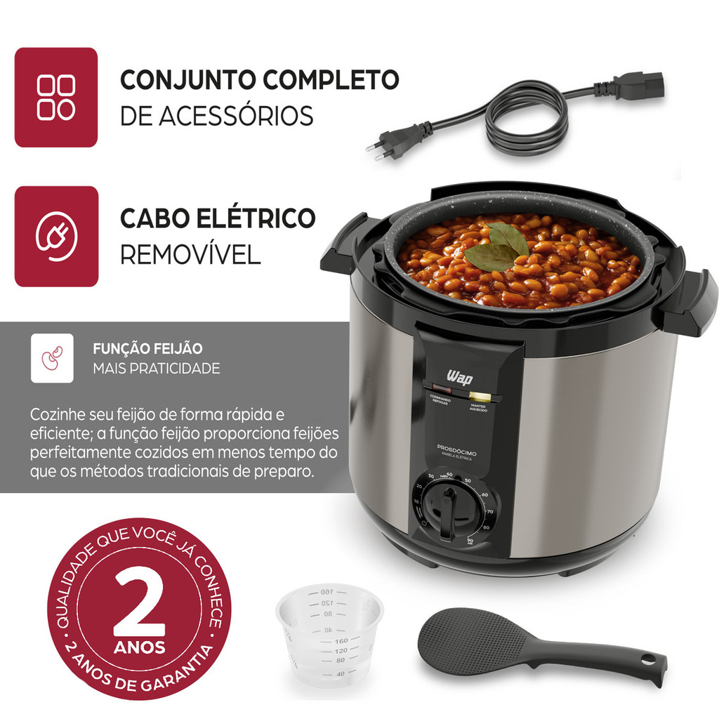 Você estará comprando: 01 Panela de Pressão 5 Litros PROSDÓCIMO WPPE2 Acessórios da Panela: - 1 Colher plástica - 1 Copo medidor - 1 Cabo elétrico 1 Metro (10A) - 1 Cesto removível Antiaderente Refeições seguras, práticas e saborosas para a família toda! Mais segura e eficiente comparada às opções tradicionais, a Panela de Pressão Elétrica WAP 5L Prosdócimo oferece tudo o que suas aventuras na cozinha precisam: economia, praticidade e confiança. Equipada com nove dispositivos de segurança, os sensores, válvulas, travas automáticas e manuais visíveis, oferecem controle total durante todo o processo de cozimento. Isso significa dar vida a refeições deliciosas de forma simples e segura, sem se preocupar com mais nada além do sabor. Imagine saborear vegetais, sopas, refogar temperos e alimentos rapidamente, tudo no ponto ideal. Com o timer de 90 minutos e aviso sonoro isso é possível! A panela de pressão elétrica 5L WAP permite criar uma variedade de pratos, ajustando o tempo de preparo de forma precisa para cada receita. Ao selecionar a “Função Feijão”, a cocção dos grãos é feita em menos tempo do que os métodos tradicionais, sem nunca perder o sabor. E, ao final do preparo, o desligamento automático ativa a "Função Manter Aquecido". Ela garante que os pratos permaneçam na temperatura ideal até a hora de servir. A capacidade interna de 5 litros da Panela de Pressão Elétrica é perfeita para preparar porções para a família toda. Seu recipiente interno removível é revestido com dupla camada antiaderente Gray Stone, o que evita que o alimento grude no fundo da panela, facilitando a limpeza. O design sofisticado em aço inox escovado da panela é moderno e combina com a sua rotina na cozinha. Além disso, ela é silenciosa, promovendo bem-estar durante o preparo das receitas. Equipada com acessórios úteis, a experiência culinária é completa. Prepare o feijão mais suculento e saboroso como um verdadeiro chef de cozinha com a melhor e mais segura aliada das receitas: a Panela de Pressão Elétrica WAP 5L Prosdócimo. Informações Técnicas: SKU: CONFI9156 Potência: 900W Tensão: 127V ou 220V (Escolher no momento da compra, quando disponível) Frequência: 60 Hz Pressão de trabalho: 70 kPa Capacidade: 5 Litros Painel: Analógico/Mecânico Função Manter Aquecido: Sim Timer: 0-90 min Aviso sonoro: Sim Trava de segurança: Sim Função Feijão: Sim Luz indicadora de funcionamento: Sim Revestimento antiaderente: Sim - GrayStone Pés antiderrapantes: Sim Tipo de tomada: 10A Comprimento do cabo elétrico: 1 metro Cor: Inox e Preto Material: Polímeros e Metais Dimensões do Produto Montado CxLxA: 33,5x34x32 cm Dimensões da Embalagem CxLxA: 31,2x31,2x35,6 cm Peso Aproximado: 4,2kg Garantia: 2 anos