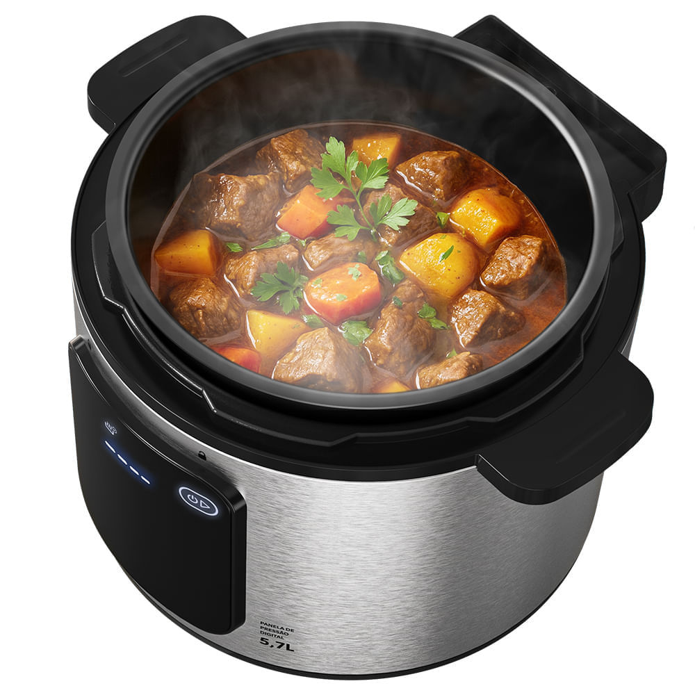 A Panela Elétrica de Pressão Digital Multifuncional Oster® é a panela de pressão elétrica com o maior número de sistemas de segurança do mercado brasileiro. Com 18 dispositivos de segurança, 12 funções pré-programadas e 5,7 L de capacidade, foi desenvolvida para famílias que valorizam refeições saudáveis e momentos de qualidade compartilhados. Tecnologia avançada que se encaixa na rotina, oferecendo funcionalidade e tranquilidade no preparo do dia a dia. - 16 travas de proteção + 2 válvulas de segurança Sistema integrado que monitora e protege em múltiplas camadas: controle de pressão, detecção de temperatura, bloqueio inteligente da tampa e válvulas de alívio automático. - Acabamento antiaderente: Facilita tanto o preparo quanto a limpeza, tornando a manutenção rápida e prática. - 12 funções pré-programadas: Arroz, feijão, sopas, carnes ensopadas, legumes no vapor e muito mais. A panela ajusta automaticamente tempo, temperatura e pressão para cada preparo. - 5,7 L de capacidade: Espaço ideal para preparar refeições completas para toda a família sem precisar repetir preparos. - Painel digital touch: Design moderno e intuitivo que facilita a operação e mantém a bancada clean e sofisticada. - 1000 W de potência: Preparo eficiente com cozimento uniforme, mantendo nutrientes e o sabor autêntico de cada receita. - Acessórios inclusos: Acompanha dosador de medida e colher para maior precisão e praticidade no dia a dia.