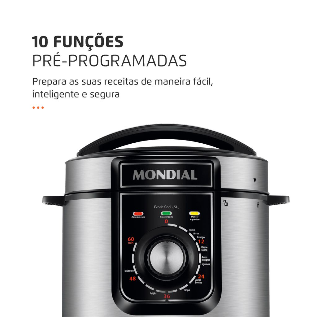 A Panela de Pressão Elétrica Pratic Cook 5L Mondial tem 5 litros de capacidade, na medida certa para toda a família. Possui painel com fácil acesso às 10 funções pré-programadas, válvula de segurança e cuba removível com revestimento antiaderente. O design em inox é sofisticado e garante mais durabilidade ao produto. Saiba mais sobre a PE-48-5L-I da Mondial: 10 FUNÇÕES PRÉ-PROGRAMADAS: Cozinhe de maneira fácil, inteligente e segura as suas melhores receitas. CAPACIDADE DE 5 LITROS: Permite o preparo dos alimentos na quantidade ideal para toda a família. VERSATILIDADE DE RECEITAS: Você pode fazer carnes, feijão, sopas, legumes, pudim e muito mais! DESIGN SOFISTICADO: Em aço inox, o acabamento garante beleza para sua cozinha e mais durabilidade. VÁLVULA DE SEGURANÇA: Impede que a pressão interna ultrapasse o limite máximo. FUNÇÃO MANTER AQUECIDO: Desliga automaticamente e conserva o alimento quentinho por mais tempo. CUBA ANTIADERENTE E REMOVÍVEL: O revestimento antiaderente evita que os alimentos grudem e facilita a limpeza. SELETOR DE FÁCIL PROGRAMAÇÃO: Você escolhe o tempo de preparo ideal para suas receitas. MAIS PRATICIDADE: A tampa ergonômica com travamento e alça, permite a utilização prática e segura, além de facilitar o transporte. COLETOR DE VAPOR: Recolhe a água condensada durante o funcionamento do produto. ACESSÓRIOS: Acompanha colher e copo medidor. UM ANO DE GARANTIA MONDIAL: A Mondial é a escolha de milhões de consumidores. Mondial, a escolha inteligente!
