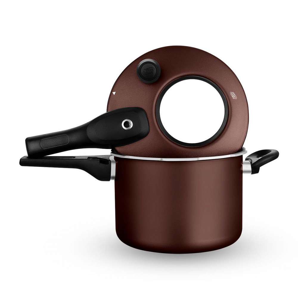 Panela de Pressão MTA Antiaderente Com Visor 4,5L Fechamento Externo Chocolate - 6603 Ideal para preparar os mais diferentes pratos e deixar a sua cozinha ainda mais completa. Conta com seu exclusivo visor de vidro inquebrável em uso 120mm, que permite que o cozimento do alimento seja acompanhado através dele. Seu revestimento Superflon Ultra MTA de antiaderente, composto por sete camadas, facilitam o manuseio e a limpeza da panela de pressão. Equipada com válvulas de segurança permite que você desfrute de uma experiência sem igual na cozinha. Proporciona um cozimento rápido e uniforme. Um design único, durabilidade, segurança e qualidade. Especificações Marca: MTA Modelo: 6603 Cor: Chocolate Capacidade 4,5 Litros Antiaderente Sim Camadas antiaderentes 7 Camadas Tipo de fechamento Externo Quantidade de válvulas de segurança 2 Tipos de fogões compatíveis A gás, Elétrico e Vitrocerâmico Compatibilidade com lava louças Sim Material do cabo Baquelite e metal Visor removível Sim Peso 2,1 kg Imagens de caráter ilustrativo. Informações divulgadas de acordo com o manual do fabricante. Em caso de dúvidas sobre informações técnicas, utilização, limitações e manuseio do produto, verifique o manual do fabricante. Produto novo na caixa, lacrado com NF e garantia do fabricante de 3 meses NAC013565 EAN: 7897186666037