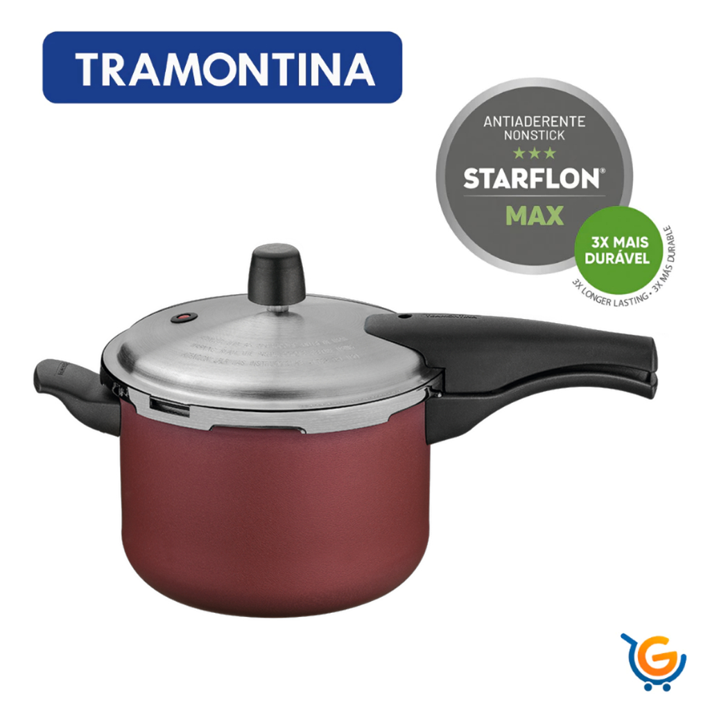 DETALHES DO PRODUTO: Já pensou em ter em sua cozinha uma panela de pressão eficiente, segura e resistente, que além de colorida e linda, também, não grude os alimentos? Pois, a panela de pressão Tramontina Vancouver em alumínio com revestimento interno e externo antiaderente Starflon Max vermelho 20 centímetros de diâmetro 4,5 litros é tudo isso e muito mais! Com um lindo revestimento interno e externo em antiaderente Starflon Max na cor vermelha, ela será a estrela do seu fogão. Ela é produzida em alumínio com espessura que proporciona o cozimento rápido e uniforme dos alimentos e vem na vibrante cor vermelha. É uma panela que possui alça e cabos antitérmicos para facilitar o manuseio e conta com três válvulas de segurança que oferecem maior proteção durante o uso. Com certeza, a escolha perfeita para completar seu ambiente e ser a protagonista em sua cozinha! INFORMAÇÕES TÉCNICAS: - Corpo de alumínio com espessura de 3,2 mm que proporciona cozimento rápido e uniforme. - Com revestimento interno e externo de antiaderente Starflon Max que não gruda, é fácil de limpar, mais durável e não é prejudicial à saúde. - Tampa de alumínio com acabamento externo polido e interno satinado. - Alça, cabos superior e inferior de baquelite antitérmico que oferecem segurança durante o manuseio. - Após atingir a pressão interna, reduza a intensidade da fonte de calor. - Pode ser utilizada nos fogões: gás, elétrico e vitrocerâmico - resistência elétrica. RECOMENDAÇÕES DE USO: - Ao utilizar utensilios quentes tenha cuidado redobrado. - Se necessário, utilize proteção para as mãos e mantenha fora do alcance de crianças. - Para sua segurança, ao utilizar utensílios com cabos, mantenha os mesmos sempre voltados para o centro do fogão. - Ao utilizar seu utensílio em fogões com grade, mantenha a peça centralizada e alinhe o cabo com a grade, para reduzir o risco de queda. - Para descarte do produto e embalagem siga as orientações de reciclagem vigentes. MATERIAL: - Alumínio com revestimento interno e externo antiaderente Starflon Max MEDIDAS: Altura: 22,90cm Largura: 23,10cm Diâmetro: 20,00 Peso: 1,7Kg Capacidade: 4,5 Litros ITENS INCLUSOS: 01 Panela de Pressão Tramontina Vancouver em Alumínio com Revestimento Interno e Externo Antiaderente Starflon Max Vermelho 20 cm 4,5 Litros. GARANTIA: 90 dias contra defeitos de fabricação. Panela de Pressão Tramontina Vancouver em Alumínio com Revestimento Interno e Externo Antiaderente Starflon Max Vermelho 20 cm 4,5 Litros.
