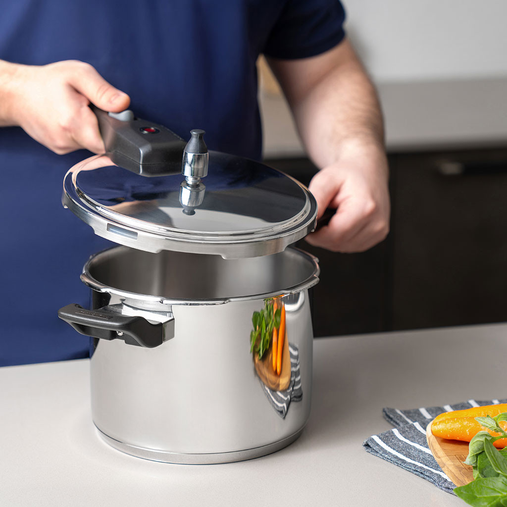 Feijão, lentilha ou grão-de-bico, todos esses alimentos ficam muito mais fáceis de serem preparados com a panela de pressão Tramontina Brava em aço inox com fundo triplo 22 centímetros 6 litros. Com ela, você irá garantir muito mais praticidade e versatilidade na hora de cozinhar, pois ela pode ser utilizada em fogões à gás, elétricos, vitrocerâmicos ou por indução. Sua produção é em aço inox com fundo triplo e para maior segurança, ela conta com cabo e alça antitérmicos, além de contar com sistema de descompressão e cinco dispositivos de segurança. Garanta já a sua e deixe sua rotina na cozinha muito mais fácil! Medidas: Diâmetro: 22cm Peso: 2,700kg Capacidade: 6 Litros Tipos de fogão: Todos Panela de Pressão Tramontina Brava de 80 kPa de pressão de trabalho. Todos os atributos do aço inox com a agilidade e desempenho que só uma panela de pressão oferece. Além da praticidade, as panelas de pressão Tramontina são extremamente seguras. Totalmente feita de aço inox, por isso não solta nenhum resíduo nos alimentos, mantendo-os saudáveis. Altamente durável, mantém as características originais, preservando a beleza, a higiene e a durabilidade do material. O fundo triplo (aço inox + alumínio + aço inox) distribui o calor uniformemente, proporcionando um cozimento mais rápido e uniforme, economizando energia e deixando os alimentos aquecidos por mais tempo. Alça e cabo antitérmico, que garantem segurança e facilidade no manuseio. A panela possui medidor de capacidade internamente, o que facilita o controle das quantidades dos alimentos. Possui sistema de descompressão. Pode ser utilizada nos fogões: gás, elétrico, vitrocerâmico e indução. Capacidade mínima: 250 ml de líquido (1/4 litro) Capacidade máxima: 2/3 da sua capacidade (alimento + líquido) É atestada pela Norma Nacional de Segurança. Acompanha manual de instruções. Recomendações de uso A capacidade volumétrica máxima para cozimento é de 2/3 da capacidade total da peça. Para manter sua panela de pressão bonita, recomenda-se lavar somente com detergente neutro e esponja macia. A Tramontina desenvolveu uma pasta especial para polir e remover manchas nos produtos de aço inoxidável, que está disponível nos principais pontos de venda. O cloro e as substâncias contidas na água podem deixar manchas no aço inox. Após a lavagem, enxágue com água quente e seque-a com pano macio. Evite deixar alimentos na panela por muito tempo. O sal também poderá provocar manchas e até corrosão. Se surgirem manchas brancas devido ao excesso de cloro na água ou amido dos alimentos, limpe-as com um pouco de vinagre ou suco de limão. Chamas muito fortes podem causar alteração na cor do aço inox, provocando manchas douradas ou azuladas. Recomenda-se utilizar fogo baixo. Não use produtos abrasivos, pois eles podem riscar o aço inoxidável. Nunca remova os parafusos de sua panela de pressão. Os componentes só devem ser manuseados pela Tramontina ou sua rede de Assistência Técnica Autorizada.
