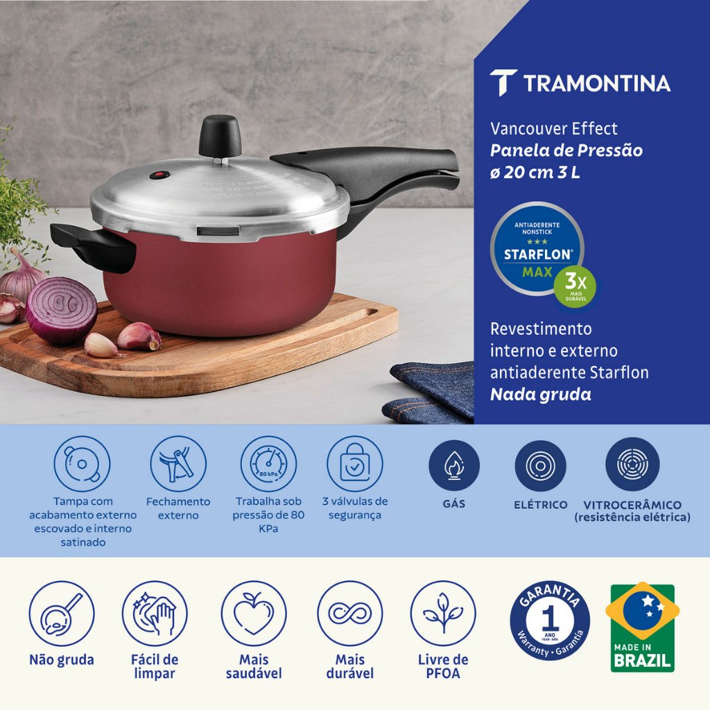 Panela de Pressão 20cm Tramontina Vancouver em Alumínio com Revestimento Antiaderente Vermelho - 3L Descrição Que tal deixar sua cozinha completa com a panela de pressão Tramontina Vancouver em alumínio com revestimento interno e externo antiaderente Starflon Max vermelho 20 centímetros de diâmetro 3 litros. Com ela, você irá tornar o preparo do seu feijão e da sua sopa ainda mais rápido e fácil, pois ela é produzida em alumínio e conta com revestimento interno e externo em antiaderente Starflon Max, ambas características que proporcionam o cozimento dos alimentos de maneira rápida e uniforme e evita que eles grudem. Com ela, você pode fazer bonito em sua cozinha e com toda a segurança necessária, pois conta com três válvulas de segurança. Além de tudo isso, ela ainda possui cabos e alça em baquelite antitérmico que reduzem a propagação de calor. O melhor da Tramontina para você e para sua cozinha! Características: - Corpo de alumínio com espessura de 3,2 mm que proporciona cozimento rápido e uniforme. - Com revestimento interno e externo de antiaderente Starflon Max que não gruda, é fácil de limpar, mais durável e não é prejudicial à saúde. - Tampa de alumínio com acabamento externo fosco e interno satinado. - Alça, cabos superior e inferior de baquelite antitérmico que oferecem segurança durante o manuseio. - Após atingir a pressão interna, reduza a intensidade da fonte de calor. - Pode ser utilizada nos fogões: gás, elétrico e vitrocerâmico - resistência elétrica. Orientações: - Ao utilizar utensilios quentes tenha cuidado redobrado. - Se necessário, utilize proteção para as mãos e mantenha fora do alcance de crianças. - Para sua segurança, ao utilizar utensílios com cabos, mantenha os mesmos sempre voltados para o centro do fogão. - Ao utilizar seu utensílio em fogões com grade, mantenha a peça centralizada e alinhe o cabo com a grade, para reduzir o risco de queda. - Para descarte do produto e embalagem siga as orientações de reciclagem vigentes. Ficha Técnica: - Fabricante: Tramontina - Produto: Panela de Pressão - Linha Comercial: Vancouver - Cód/Modelo: 20593720 - Código de Barras: 7891112348943 - Material: Alumínio - Cor: Vermelha - Capacidade: 3L - Tipo de Fogão: Gás, Elétrico, Vitrocerâmico - resistência elétrica - Máquina de Lavar Louça: Não - Diâmetro: Ø 20cm - Dimensão: 385x243x172 mm - Peso: 1.815 kg Contéudo: - 01 Panela de Pressão 20cm Tramontina Vancouver em Alumínio com Revestimento Antiaderente Vermelho - 3L