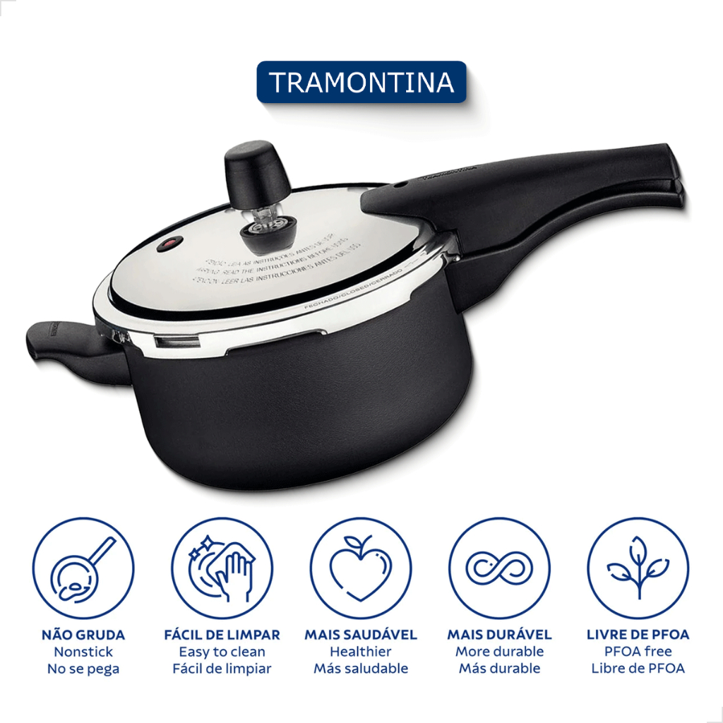Prepare suas receitas favoritas com toda a agilidade da panela de pressão Tramontina Vancouver em alumínio com revestimento interno e externo antiaderente Starflon Max grafite de 20 centímetros de diâmetro e capacidade de 3 litros. Perfeita para sua rotina na cozinha, ela permite o preparo dos alimentos mais saborosos de maneira rápida e uniforme. O corpo em alumínio de 3,2 mm de espessura garante um cozimento eficiente e homogêneo, enquanto o revestimento antiaderente Starflon Max facilita a limpeza, é durável e seguro para a saúde. 20586720 Características Principais: - Corpo de alumínio com espessura de 3,2 mm para cozimento rápido e uniforme. - Revestimento interno e externo antiaderente Starflon Max, que não gruda, é fácil de limpar e mais durável. - Tampa de alumínio com acabamento externo polido e interno satinado. - Alça, cabos superior e inferior de baquelite antitérmico para segurança durante o manuseio. - Trabalha sob pressão de 80 kPa e possui três válvulas de segurança para proteção adicional. - Pode ser utilizada em fogões a gás, elétricos e vitrocerâmicos (resistência elétrica). Ficha Técnica: - Marca: Tramontina - Linha: Vancouver - Material: Alumínio com revestimento antiaderente Starflon Max - Capacidade: 3 litros - Diâmetro: 20 cm - Pressão de trabalho: 80 kPa - Garantia: 90 dias Conteúdo da Embalagem: - 1 Panela de pressão Tramontina Recomendações de Uso: - Utilize proteção para as mãos ao manusear utensílios quentes. - Mantenha fora do alcance de crianças. - Posicione os cabos sempre voltados para o centro do fogão ao cozinhar. - Descarte o produto e embalagem seguindo as orientações de reciclagem. A panela de pressão Tramontina Vancouver é a escolha ideal para quem busca praticidade, segurança e qualidade na cozinha.