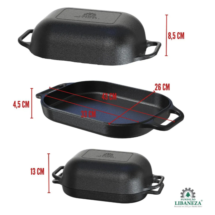 Panela de assar pão / Assadeira Multiuso Levain fabricada em ferro fundido Libaneza Na busca pela arte de fazer pão caseiro perfeito, muitos padeiros entusiastas descobriram o encanto da panela de ferro. Esse utensílio robusto e versátil oferece um ambiente de cozimento único que resulta em pães dourados, crocantes por fora e macios por dentro. Vamos explorar as maravilhas dessa ferramenta culinária e como ela eleva a experiência de assar pão a um novo patamar. 1. Retenção de Calor: Uma das características marcantes da panela de ferro é sua incrível capacidade de reter e distribuir calor de maneira uniforme. Esse atributo é fundamental para assar pães de forma consistente, garantindo que cada parte da massa receba o calor necessário para uma cocção perfeita. A tampa hermética contribui para a criação de um ambiente de vapor interno, resultando em uma crosta estaladiça e uma migalha suculenta. 2. Do Fogão ao Forno: Uma das características mais notáveis das panelas em ferro fundido é sua capacidade de transitar perfeitamente entre o fogão e forno, seja ele a gás, lenha, elétrico ou indução. Seja selando carnes no fogão ou assando pães no forno, essas panelas são verdadeiramente multitarefas. Essa versatilidade simplifica o processo de cozimento, permitindo que os chefs caseiros experimentem uma ampla gama de técnicas culinárias com uma única peça de cozinha 3. Pré-aquecimento Eficiente: A natureza densa e condutora de calor do ferro permite um rápido pré-aquecimento da panela. Isso é particularmente útil ao assar pães, pois a temperatura elevada no início do processo ajuda a criar uma crosta firme e desenvolver o sabor do pão. O pré-aquecimento eficiente também contribui para economia de energia, tornando a panela de ferro uma escolha sustentável. 4. Durabilidade e Longevidade: Investir em uma boa panela de ferro é como adquirir um tesouro culinário para toda a vida. Com os devidos cuidados, essas panelas são conhecidas por durar gerações. A pátina natural que se forma ao longo do tempo adiciona um toque especial ao processo de assar pão, conferindo aos pães um sabor único e uma aparência rústica. 5. Dicas para Assar Pão na Panela de Ferro: Pré-aqueça a panela no forno enquanto prepara a massa. Sempre unte a panela ou use papel manteiga para evitar que o pão grude. Experimente diferentes formatos de panela para criar pães com formas e tamanhos variados. Varie a temperatura do forno ao longo do processo para ajustar a crocância da crosta. Deixe o pão descansar na panela por alguns minutos após o cozimento para aprimorar a textura. Em resumo, a panela de ferro para assar pão não é apenas uma ferramenta, mas uma aliada na busca pela perfeição na panificação caseira. Seja você um padeiro amador ou experiente, essa peça clássica de cozinha certamente elevará seus pães a um nível superior de sabor e textura. A mais procurada para fazer pães artesanais, roscas e outras receitas, a mais indicada por padeiros, pode ser levada a qualquer forno seja gás, lenha, elétrico e até fogões de indução, a qualidade da panela de ferro fundido é incomparável e ira deixar seu assado com aquela casquinha crocante de padaria profissional Sua versatilidade permite cozinhar diversos alimentos, como guisados, frango, carnes, massas, doces e gratinados! A base pode ser usada como chapa ou frigideira! Um Produto Multiuso de alta qualidade, projetada para fazer pães artesanais, baguetes, bolos, roscas e outros. • A Tampa pode ser usada separadamente como assadeira • Multifuncional podendo ser usado como assadeira e frigideira para o preparo de carnes, peixes, omeletes, grelhados e outros • Alças bem acabadas que facilitam o manuseio • Alta Versatilidade podendo também ser usada em fogões a gás, indução, fogões a lenha ou churrasqueira Como são fabricados em FERRO FUNDIDO tem a durabilidade como maior qualidade, proporcionam assados uniformes e saborosos. • Medidas total: 14cm Altura x 42cm x 26cm (Diametro 33x26) • Medidas Tampa: 4cm Altura x 42cm x 26cm (Diametro 33x26) • Peso: 8,77KG • Capacidade: 7,4 Litros