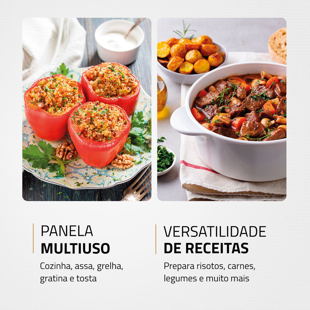 A Panela Elétrica MultiCook Premium PE-49 Mondial é uma grande aliada de quem busca uma alimentação mais saudável. Graças ao seu revestimento antiaderente, você não precisa adicionar uma gota de óleo ou manteiga em suas receitas. Multiuso, a panela cozinha, assa, grelha e muito mais. Possui controle de temperatura e tampa de vidro temperado, tudo para facilitar os preparos. Saiba mais sobre o PE-49 da Mondial: REVESTIMENTO ANTIADERENTE: A panela elétrica possui chapa com revestimento antiaderente. Os alimentos deslizam facilmente e não grudam. PANELA MULTIUSO: A panela Mondial cozinha, assa, grelha, frita, aquece, gratina e tosta. ALIMENTAÇÃO MAIS SAUDÁVEL: Com o revestimento antiaderente, você prepara suas receitas sem adicionar uma gota de óleo. São pratos mais saudáveis e que mantêm o sabor e as propriedades dos alimentos. CONTROLE DE TEMPERATURA: São 5 ajustes de temperatura e você pode escolher o ideal para cada tipo de preparo. LÂMPADA PILOTO: Indica o funcionamento do produto. TAMANHO FAMÍLIA: Com chapa de 30 cm e capacidade de 4 litros, a panela elétrica quadrada é espaçosa e permite preparar grandes porções. DESIGN PRÁTICO E ELEGANTE:A panela pode ser levada à mesa durante as refeições. É prática e requintada! POTÊNCIA DE 1.200W: Alta potência que garante mais agilidade e eficiência no preparo de receitas variadas. TAMPA EM VIDRO TEMPERADO COM SAÍDA DO VAPOR: A tampa colabora com uma preparação mais rápida, além de evitar respingos. O vidro temperado é resistente a quedas e mais durável. ALÇAS ANATÔMICAS E ISOTÉRMICAS: São fáceis de usar e não esquentam, permitindo o manuseio com segurança. VERSATILIDADE NA COZINHA: A panela elétrica permite que você prepare uma diversidade de receitas: diferentes tipos de carnes, peixes, risotos, almôndegas, legumes e verduras, entre outros. UM ANO DE GARANTIA MONDIAL: A Mondial é a escolha de milhões de consumidores. Mondial, a escolha inteligente!