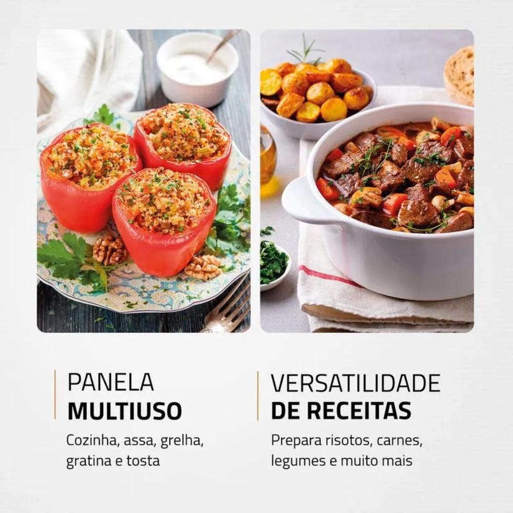A Panela Elétrica MultiCook Premium PE-49 Mondial é uma grande aliada de quem busca uma alimentação mais saudável. Graças ao seu revestimento antiaderente, você não precisa adicionar uma gota de óleo ou manteiga em suas receitas. Multiuso, a panela cozinha, assa, grelha e muito mais. Possui controle de temperatura e tampa de vidro temperado, tudo para facilitar os preparos. CARACTERÍSTICAS: REVESTIMENTO ANTIADERENTE: A panela elétrica possui chapa com revestimento antiaderente. Os alimentos deslizam facilmente e não grudam. PANELA MULTIUSO: A panela Mondial cozinha, assa, grelha, frita, aquece, gratina e tosta. ALIMENTAÇÃO MAIS SAUDÁVEL: Com o revestimento antiaderente, você prepara suas receitas sem adicionar uma gota de óleo. São pratos mais saudáveis, que mantêm o sabor e as propriedades dos alimentos. CONTROLE DE TEMPERATURA: São 5 ajustes de temperatura e você pode escolher o ideal para cada tipo de preparo. LÂMPADA PILOTO: Indica o funcionamento do produto. TAMANHO FAMÍLIA: Com chapa de 30 cm e capacidade de 4 litros, a panela elétrica quadrada é espaçosa e permite preparar grandes porções. DESIGN PRÁTICO E ELEGANTE: A panela pode ser levada à mesa durante as refeições. É prática e requintada! POTÊNCIA DE 1.200W: Alta potência que garante mais agilidade e eficiência no preparo de receitas variadas. TAMPA EM VIDRO TEMPERADO COM SAÍDA DO VAPOR: A tampa colabora com uma preparação mais rápida, além de evitar respingos. O vidro temperado é resistente a quedas e mais durável. ALÇAS ANATÔMICAS E ISOTÉRMICAS: São fáceis de usar e não esquentam, permitindo o manuseio com segurança. VERSATILIDADE NA COZINHA: A panela elétrica permite que você prepare uma diversidade de receitas: diferentes tipos de carnes, peixes, risotos, almôndegas, legumes e verduras, entre outros. ESPECIFICAÇÕES: Altura: 16 cm Largura: 41,5 cm Profundidade: 30,5 cm Peso: 1,9 kg Potência: 1.200W Tensão/Voltagem: 220V Cor: Preto CONTEÚDO DA EMBALAGEM: 1 Panela Elétrica 1 Manual de Instruções