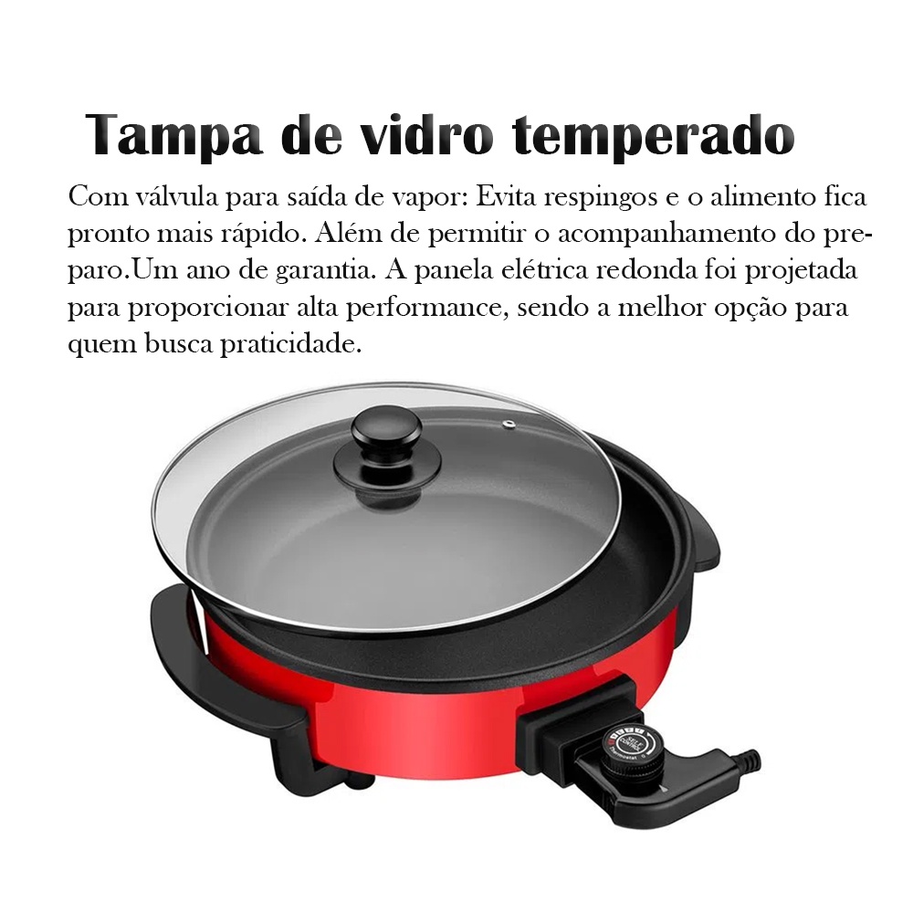 Panela Elétrica Mondial MultiCook Red 1200W PE-28 - 110V Quem deveria comprar este produto? Ideal para quem busca praticidade e versatilidade na cozinha, deseja preparar diferentes tipos de receitas em um único aparelho e valoriza agilidade no dia a dia. Para quem mora sozinho, casais ou famílias que querem cozinhar, fritar, refogar e aquecer alimentos com facilidade, contando com aquecimento rápido de 1200W, controle de temperatura ajustável e limpeza simples graças ao revestimento antiaderente. Também é uma excelente escolha para quem procura um eletrodoméstico funcional, moderno e eficiente, que otimize espaço e tempo na rotina. A Panela Elétrica Mondial MultiCook Red PE-28 foi desenvolvida para trazer mais praticidade, versatilidade e eficiência ao preparo das refeições. Com potência de 1200W, proporciona aquecimento rápido e cozimento uniforme, sendo ideal para preparar carnes, massas, legumes, refogados, arroz e diversas outras receitas do dia a dia. Seu revestimento interno antiaderente facilita a limpeza, evita que os alimentos grudem e permite cozinhar com menos óleo. O design moderno na cor vermelha agrega estilo à cozinha, enquanto a tampa de vidro temperado com saída de vapor garante mais praticidade e segurança durante o uso. CARACTERÍSTICAS: Panela elétrica multifuncional Potência de 1200W para preparo rápido e eficiente Revestimento interno antiaderente Controle de temperatura ajustável Tampa de vidro temperado com saída de vapor Permite cozinhar, fritar, refogar e aquecer alimentos Design moderno na cor vermelha ESPECIFICAÇÕES TÉCNICAS: Marca: Mondial Modelo: MultiCook Red PE-28 Tipo: Panela Elétrica Potência: 1200W Voltagem: 110v Material: Metal e plástico Revestimento interno: Antiaderente Cor: Vermelha Controle de temperatura: Sim DIMENSÕES DO PRODUTO: Altura: 13 cm Largura: 36 cm Profundidade: 29 cm DIMENSÕES DA EMBALAGEM: Altura: 15 cm Largura: 38 cm Profundidade: 31 cm GARANTIA: 12 meses de garantia pelo fabricante.