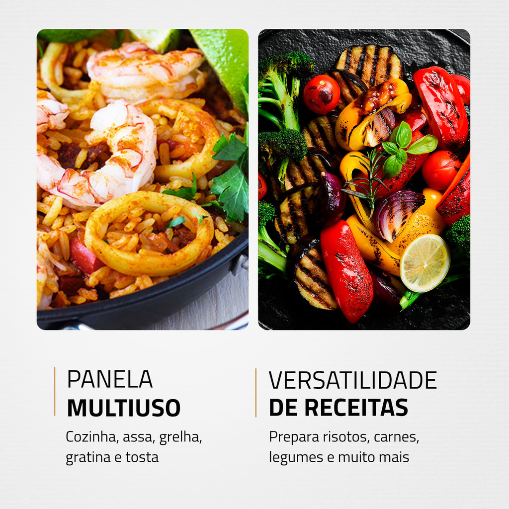 A Panela Elétrica MultiCook Red Premium PE-28 Mondial prepara diversos tipos de pratos com mais rapidez, garantindo mais sabor e, o melhor, de forma mais saudável! Ela possui revestimento antiaderente e não é necessário adicionar uma gota de óleo em suas receitas. Multiuso, a panela cozinha, assa, grelha e muito mais. Possui controle de temperatura e tampa de vidro temperado, tudo para facilitar os preparos. Saiba mais sobre o PE-28 da Mondial: REVESTIMENTO ANTIADERENTE: A panela elétrica possui chapa com revestimento antiaderente. A linha Red Ceramic tem tecnologia desenvolvida a partir da cerâmica: os alimentos deslizam facilmente e não grudam. PANELA MULTIUSO: A panela Mondial cozinha, assa, grelha, frita, aquece, gratina e tosta. ALIMENTAÇÃO MAIS SAUDÁVEL: Com o revestimento antiaderente, você prepara suas receitas sem adicionar uma gota de óleo. São pratos mais saudáveis e que mantêm o sabor e as propriedades dos alimentos. CONTROLE DE TEMPERATURA: De 40°C a 240°C: Você pode ajustar a intensidade da temperatura de acordo com a receita que vai preparar. LÂMPADA PILOTO: Indica o funcionamento do produto. TAMANHO FAMÍLIA: Com chapa de 30 cm e maior profundidade, a panela elétrica é espaçosa e permite preparar grandes porções. DESIGN PRÁTICO E ELEGANTE: A panela pode ser levada à mesa durante as refeições. É prática e requintada! POTÊNCIA DE 1.200W: Alta potência que garante mais agilidade e eficiência no preparo de receitas variadas. TAMPA EM VIDRO TEMPERADO COM SAÍDA DO VAPOR: A tampa colabora com uma preparação mais rápida, além de evitar respingos. O vidro temperado é resistente a quedas e mais durável. VERSATILIDADE NA COZINHA: A panela elétrica permite que você prepare uma diversidade de receitas: diferentes tipos de carnes, peixes, risotos, almôndegas, legumes e verduras, entre outros. UM ANO DE GARANTIA MONDIAL: A Mondial é a escolha de milhões de consumidores. Mondial, a escolha inteligente!