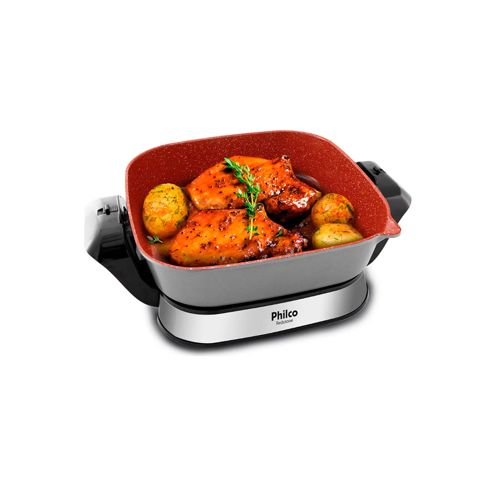 A Panela Elétrica Philco Redstone 4L PPE04 127V foi desenvolvida para tornar o preparo dos alimentos mais rápido, prático e versátil, ajudando a preservar melhor o sabor e os nutrientes. Com capacidade máxima de 4 litros, ela é uma ótima opção para o dia a dia e para quem busca mais praticidade no preparo de diferentes receitas. PRINCIPAIS DIFERENCIAIS O modelo conta com revestimento cerâmico Redstone, que oferece maior durabilidade, resistência e facilita a limpeza no uso diário. Também possui seletor de temperatura removível com 5 níveis, tampa de vidro temperado, alças removíveis nas laterais, base antiderrapante, luz indicadora de funcionamento e bico no canto para líquidos, trazendo mais facilidade no manuseio. DESEMPENHO E USO Com potência de 1200W, a panela elétrica entrega aquecimento eficiente para preparar diversos tipos de alimentos com mais praticidade. Seu controle de temperatura permite ajustar o funcionamento conforme a necessidade da receita, tornando o uso mais versátil para diferentes preparos no dia a dia. ACABAMENTO E PRATICIDADE Além do visual moderno na cor vermelha, a Philco Redstone possui estrutura pensada para facilitar o uso e a limpeza. O revestimento é livre de PFOA, PTFE e PFOS, enquanto a tampa de vidro ajuda no acompanhamento do preparo sem necessidade de abrir o produto a todo momento. IDEAL PARA Preparar diversos tipos de alimentos com mais praticidade. Ter mais controle de temperatura no preparo. Facilitar a limpeza no dia a dia. Contar com uma panela elétrica versátil e funcional. Levar mais agilidade para a rotina da cozinha. ESPECIFICAÇÕES TÉCNICAS Marca: Philco Modelo: PPE04 Voltagem: 127V Potência: 1200W Capacidade máxima: 4 litros Volume útil: 3 litros Cor: Vermelho Tipo: Panela elétrica Revestimento: Cerâmico Redstone Material: Metal, plástico e vidro Tampa: Vidro temperado Controle de temperatura: Removível com 5 níveis Alças laterais removíveis: Sim Base antiderrapante: Sim Luz indicadora de funcionamento: Sim Bico para líquidos: Sim Garantia: 12 meses CONTEÚDO DA EMBALAGEM 1 panela elétrica Philco Redstone 4L PPE04 1 tampa de vidro 1 seletor de temperatura removível 1 manual de instruções DIMENSÕES DO PRODUTO SEM EMBALAGEM Altura: 17,5 cm Largura: 41 cm Profundidade: 28 cm Peso: 2,66 kg DIMENSÕES DO PRODUTO COM EMBALAGEM Altura: 34 cm Largura: 31 cm Profundidade: 16,4 cm Peso: 3 kg OBSERVAÇÃO A Panela Elétrica Philco Redstone 4L PPE04 127V reúne boa capacidade, potência de 1200W e acabamento pensado para facilitar o uso no dia a dia. É uma excelente escolha para quem busca praticidade, fácil limpeza e um produto versátil para diferentes preparos na cozinha.