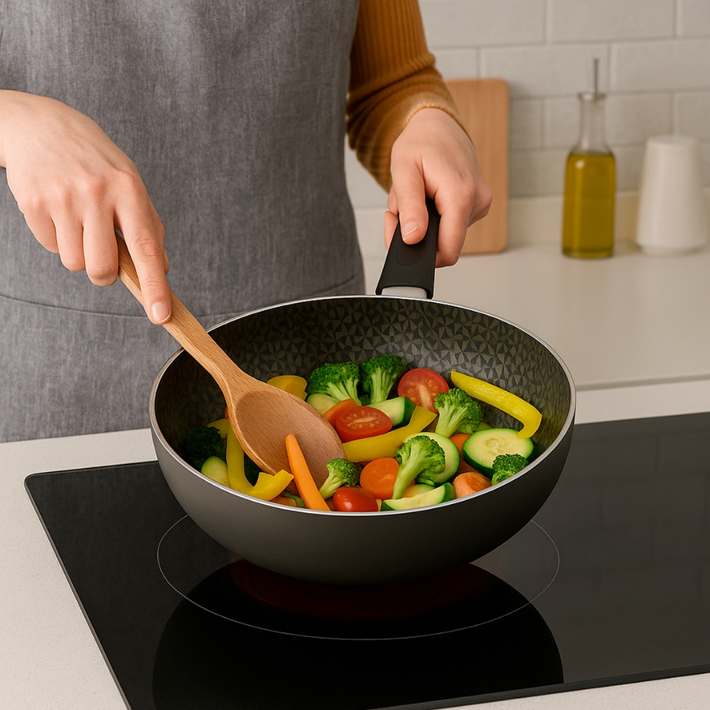 O Wok Gran Chef Nº 24 sem tampa de vidro é a escolha ideal para quem busca praticidade, versatilidade e desempenho na cozinha. Produzido em alumínio com revestimento antiaderente de alta qualidade, ele impede que os alimentos grudem, garantindo preparos mais saudáveis, uso reduzido de óleo e uma limpeza muito mais fácil. Outro grande diferencial é a sua base magnética especial, que permite o uso não só em fogões a gás e elétricos, mas também em fogões de indução – oferecendo aquecimento rápido, uniforme e eficiente. Principais Características 1. Compatível com Fogão de Indução Equipado com fundo magnético, o wok pode ser utilizado perfeitamente em cooktops de indução, além de fogões a gás e elétricos. 2. Revestimento Antiaderente Impede que os alimentos grudem, facilita a limpeza e aumenta a durabilidade da peça. 3. Tamanho Ideal – 24 cm de diâmetro Espaço suficiente para preparar receitas variadas em porções generosas. 4. Sem Tampa (Compatível com Tampas Universais) Pode ser usado com tampas universais de vidro ou inox, se necessário. 5. Fácil Limpeza Graças ao revestimento antiaderente, basta uma esponja macia e sabão neutro para deixá-lo limpo rapidamente. ________________________________________ Vantagens do Wok Gran Chef ✔ Antiaderente de qualidade – menos óleo, mais saúde. ✔ Compatível com fogão de indução – eficiência e economia de energia. ✔ Aquecimento rápido e uniforme ✔ Mais segurança – a superfície do cooktop permanece menos quente. ✔ Controle preciso de temperatura – perfeito para receitas delicadas. ________________________________________ Especificações Técnicas • Modelo: Wok Gran Chef Nº 24 • Diâmetro: 24 cm • Material: Alumínio com revestimento antiaderente • Cor: Grafite (também disponível em vermelho) • Compatibilidade: Fogão a gás, elétrico e indução • Tampa: Não inclusa (compatível com tampas universais) • Cabo: Ergonômico, resistente ao calor • Fácil Limpeza: Sim • Suas dimensões são: 40cm x 24cm x 7cm.