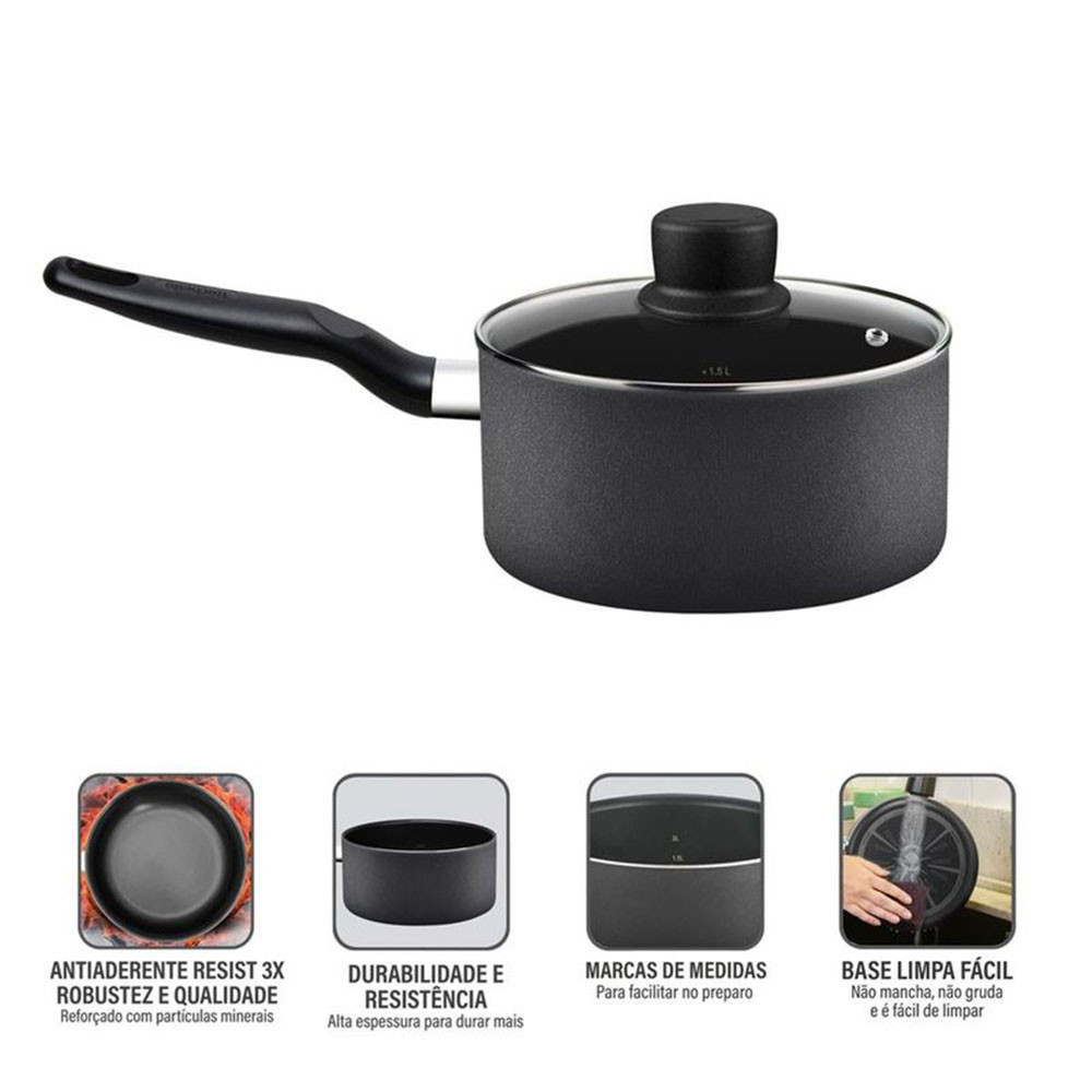 Linha Rochedo Robusta, com antiaderente Resist 3x: robustez e qualidade. Reforçado com partículas minerais, dura mais. Com a Panela Rochedo Robusta Grafite 18cm você surpreende sua família com robustez e durabilidade. Conheça todos os diferenciais dessa linha: Antiaderente Resist 3X: Robustez e Qualidade. Reforçado com partículas minerais, dura mais. Durabilidade e resistência: Alta espessura para durar mais Base limpa fácil: Não mancha, não gruda e é fácil de limpar. Marcas de Medidas: Para facilitar o preparo Além de contar com a qualidade da marca Rochedo, presente no Brasil há mais de 100 anos, a Panela Rochedo Robusta Grafite 18cm é livre de substâncias tóxicas (PFOA), garantindo a segurança no uso do produto. Pode ir em todos os tipos de fogões, exceto indução, compatível com máquina de lavar louças. Especificação técnica: Modelo: Rochedo. Cor: Grafite. Tipo de material: Alumínio. Fontes de calor: Todos, exceto indução. Conteúdo da embalagem: 1 Panela 18cm.