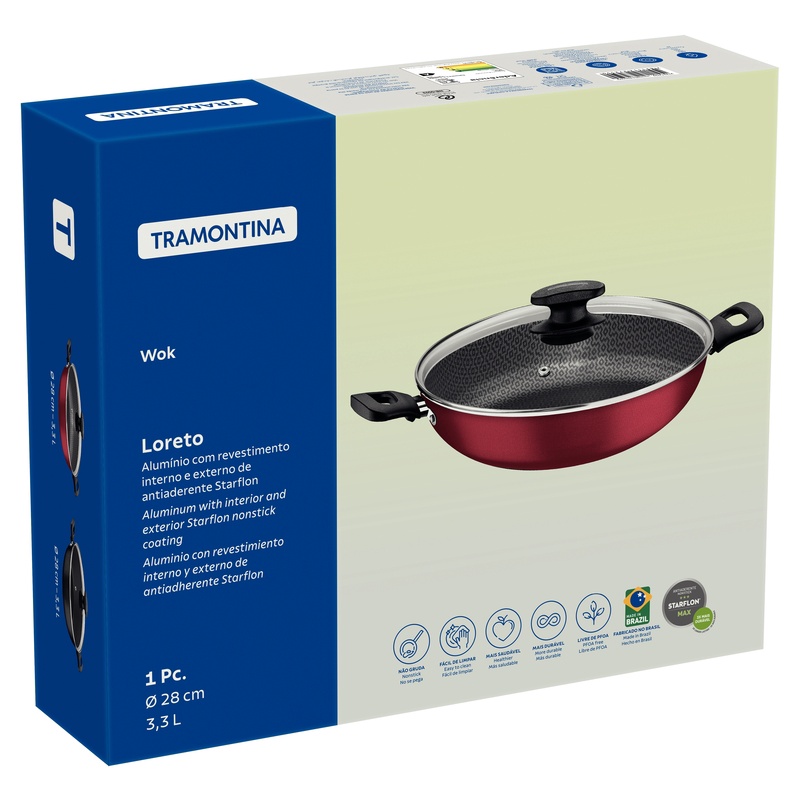 MATERIAL : ALUMÍNIO COM REVESTIMENTO INTERNO ANTIADERENTE STARFLON Máx . ALÇAS DE BAQUELITE ANTITERMICO . TAMPA DE VIDRO TEMPERADO COM BORDA DE INOX E SAÍDA DE VAPOR . COR : VERMELHO CONTEUDO DA EMBALAGEM : 1 PANELA WORK DE Ø 28 CM . TIPO DE FOGÃO : GÁS, ELÉTRICO , VITROCÊRAMICO - RESISTÊNCIA ELÉTRICA Corpo de alumínio com espessura de 1,8 mm Preparar suas receitas favoritas ficou muito mais prático com a Wok Tramontina Loreto em Alumínio com Revestimento Interno Antiaderente Starflon T1 com Tampa de Vidro Vermelha 28 cm de diâmetro 3,3 L. Produzida em alumínio com revestimento interno e externo de antiaderente Starflon T1, possui maior poder de antiaderência, maior resistência à abrasão e maior durabilidade, além disso conta com decoração interna exclusiva e supermoderna. A tampa é produzida em vidro temperado com saída de vapor e borda de aço inox. A Wok Tramontina garante rapidez no preparo graças ao seu formato e seu revestimento proporciona um cozimento muito mais saudável . Antes do primeiro uso, lave com esponja macia, sabão neutro ou detergente líquido. Depois de secar, unte a área interna com óleo ou gordura e leve ao fogo por um ou dois minutos. Deixe esfriar e lave novamente.Seu utensílio Starflon está pronto para uso com ou sem gordura, sempre em fogo baixo ou médio (nunca superior a 350ºC). Para mexer os alimentos use somente utensílios de silicone, nylon ou madeira. Evite a imersão do utensílio quente em água fria. Nunca utilize produtos abrasivos na lavagem. Se deixar queimar alimentos, umedeça a área e reserve até que possa remover os resíduos grudados com esponja e sabão. Para descarte dos produtos e embalagens siga as orientações de reciclagem vigentes. Este produto não necessita de manutenção, apenas limpeza.