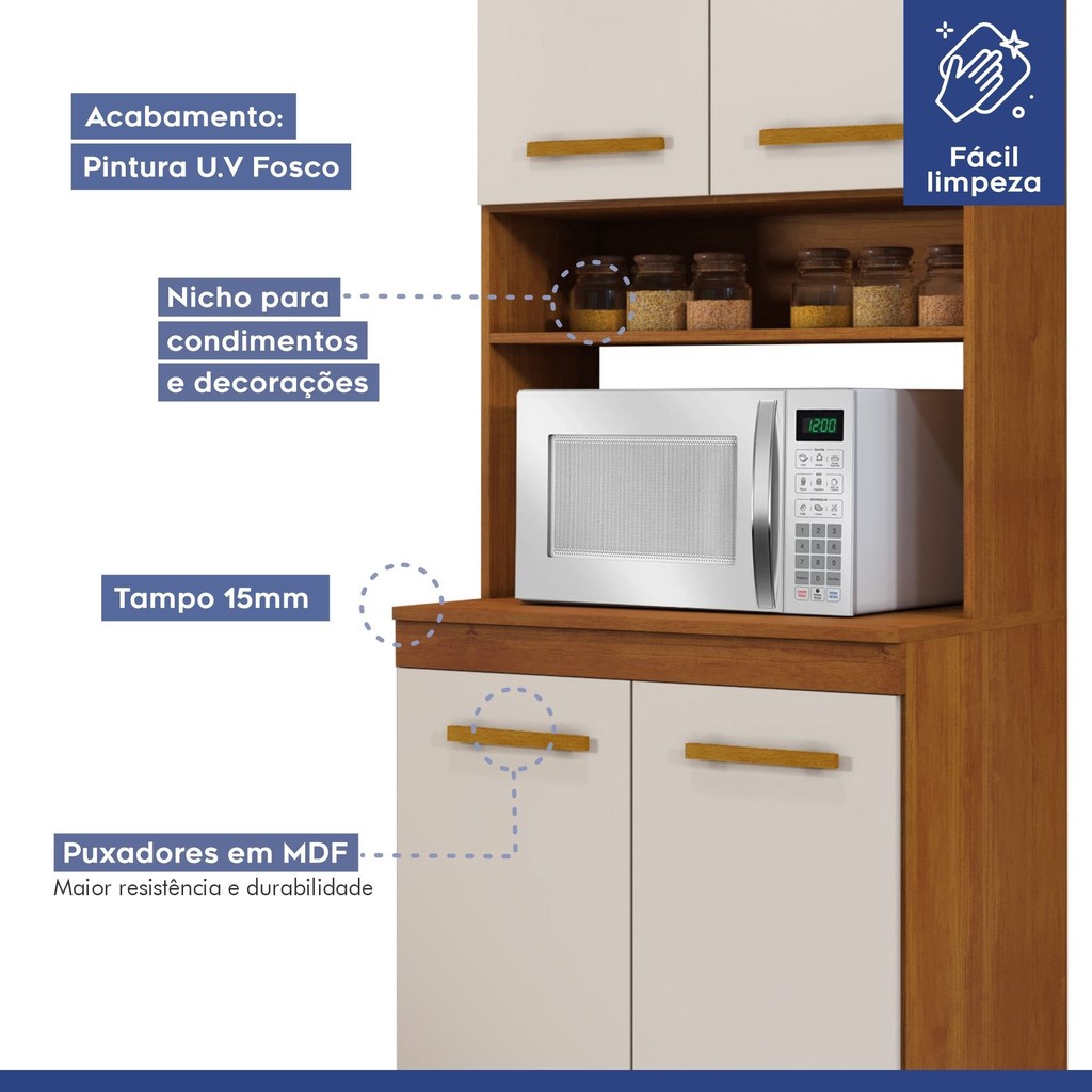 Nosso Paneleiro com nicho para micro-ondas é a solução perfeita para quem quer praticidade e charme na cozinha! Com nichos e prateleiras ajustáveis, ele maximiza o espaço e deixa tudo à mão, sem aquela bagunça que ninguém gosta. Ideal para cozinhas pequenas ou grandes, ele combina com qualquer decoração! Não fique de fora dessa; transforme sua decoração para cozinha em um espaço funcional e elegante com nosso paneleiro incrível! Posso usar o armário para lavanderia? Claro, basta usar a criatividade e ele se encaixa em vários ambientes. É um paneleiro para cozinha pequena? Por ser um armário com prateleiras, ele fica ideal para cozinha de diversos tamanhos. Estilo: Moderno Modular: Sim Peso (kg): 41 Garantia: 06 Meses Altura (cm): 211 Acabamento: Pintura UV Largura (cm): 67 Possui Pés: Sim Tipo de Porta: Bater Altura dos Pés: 17 Pés Reguláveis: Sim Possui Gavetas: Não Possui Rodízio: Não Suporta Até (kg): 55 Possui Espelhos: Não Profundidade (cm): 53 Escala de Brilho: Semi-Brilho Material dos Pés: Plástico Material da Porta: MDP Origem do Produto: Nacional Rodízio com Trava: Não Tipo de Paneleiro: Paneleiro Forno Acabamento dos Pés: Liso Ambiente Principal: Cozinha Material Principal: MDP Acabamento da Porta: Pintura Texturizada UV Material do Puxador: MDF Sapatas Niveladoras: Não Material da Prateleira: MDP Acabamento da Prateleira: Pintura Texturizada UV Tipo de Puxador da Porta: Externo Escala de Brilho da Porta: Semi-Brilho Peso Máximo por Prateleira: 10 Tipo de Armário de Cozinha: Paneleiro Material do Puxador da Porta: MDF Material do Puxador da Gaveta: MDF Escala de Brilho da Prateleira: Semi-Brilho Tipo de Dobradiça/Corrediça da Porta: Simples Marca: Kaiki Móveis Cor Flex: Não Tonalidade: Off White / Natural Cor Interna: Branco Cor: Nature/Off White Cor do Produto: Nature/Off White Itens Inclusos: 1 Paneleiro, Kit Ferragens e Manual de Montagem. Cor Predominante: Marrom