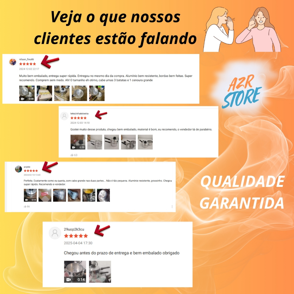 CUSCUZEIRO E LEGUMEIRA 2 em 1 PORÇÃO INDIVIDUAL COZIMENTO A VAPOR ****VERIFIQUE TAMANHO (FOTOS REAIS) E ESPECIFICAÇÕES TÉCNICAS DO PRODUTO ANTES DE REALIZAR A COMPRA**** A sua cozinha precisa de alguns itens indispensáveis para ficar completa, esta panela é uma ótima opção para quem procura por praticidade e utilidade, garantindo mais qualidade na hora de preparar aquela deliciosa porção individual de cuscuz ou uma pequena porção de legumes. O cuscuzeiro/ legumeira de alumínio individual além de ser ideal para o preparo de cuscuz também pode ser utilizado para preparo de legumes no vapor e para reaquecer alimentos. É altamente resistente e não solta nenhum resíduo nos alimentos, conservando-os e deixando-os ainda mais saudáveis. ****DISPONÍVEL NAS FOTOS MODO DE PREPARO E DELICIOSAS OPÇÕES DE ACOMPANHAMENTOS**** - PRODUTO EM ESTOQUE - ENVIO IMEDIATO APÓS A CONFIRMAÇÃO DE PAGAMENTO ESPECIFICAÇÕES E CARACTERÍSTICAS: - Composição: Alumínio polido(panela) Baquelite(cabos) - Modelo: Porção Individual DIMENSÕES DO PRODUTO: - Altura: 14 cm - Largura: 11,5 cm - Peso: 200 gramas DIFERENCIAIS: - Compra 100% segura - Produto disponível a pronta entrega - Postamos sua encomenda no mesmo dia ou no máximo no próximo dia útil Tire todas as suas duvidas no campo de perguntas, estamos a disposição! ÓTIMAS COMPRAS!!! EQUIPE A2R ECOMMERCE
