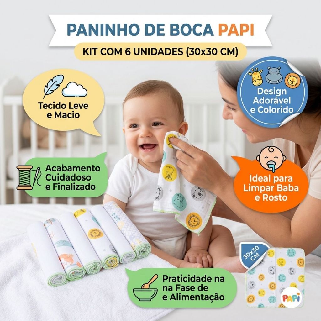 🍼 Kit Paninho de Boca Papi Têxtil – 6 Unidades 30x30 Facilite sua rotina com o bebê com um item essencial, prático e super versátil! 💙 Os paninhos de boca da Papi Têxtil são ideais para o dia a dia, feitos com tecido leve, macio e confortável para a pele delicada do bebê. ✨ Diferenciais: ✔️ Kit com 6 unidades – mais praticidade no dia a dia ✔️ Tamanho ideal: 30x30 cm ✔️ Tecido leve, macio e confortável ✔️ Estampas adoráveis ✔️ Alta absorção ✔️ Produto multiuso 👶 Perfeito para: * Limpar a boquinha * Apoiar na amamentação * Proteger a roupinha * Usar na introdução alimentar 💡 Item indispensável no enxoval do bebê!