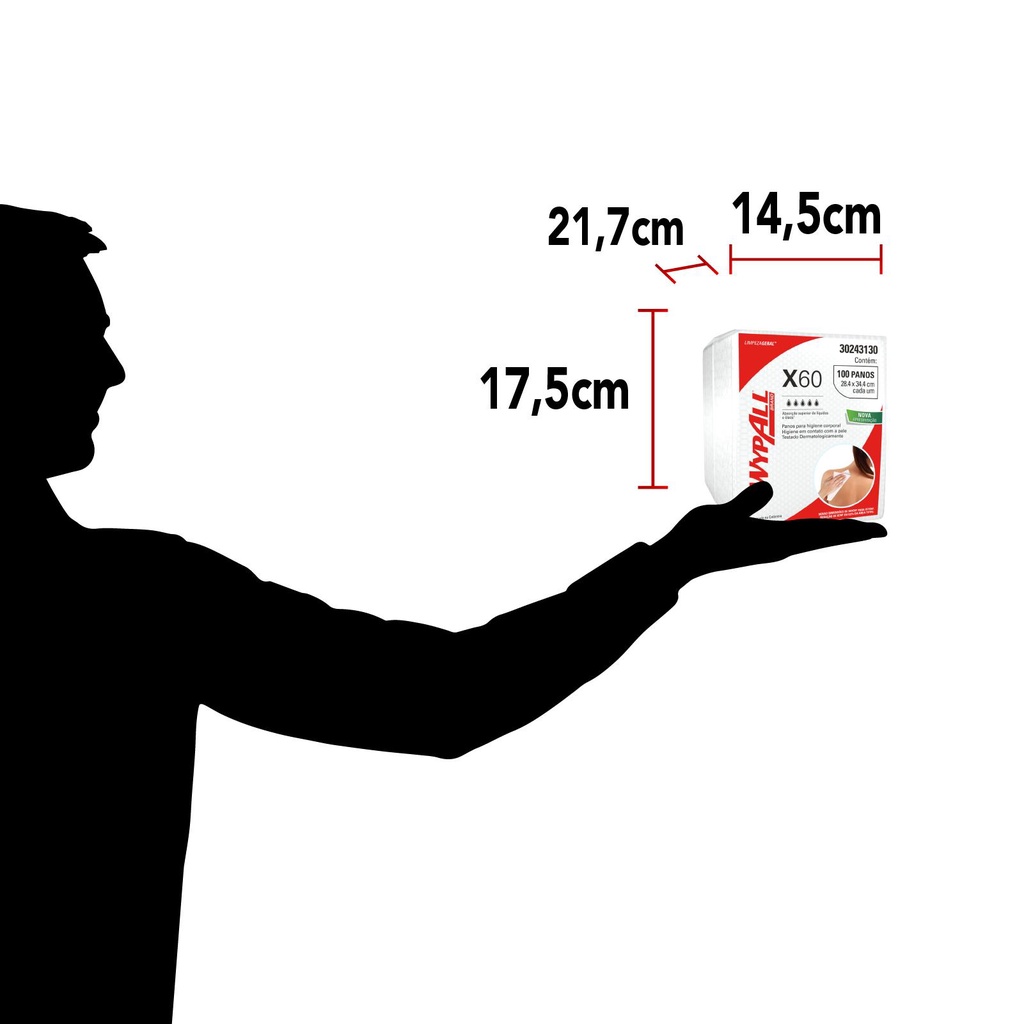 O pano de limpeza descartável WypAll® X60 Higiene Corporal é recomendado para limpeza e secagem de pessoas, além de remoção de gel e contenções. Dermatologicamente testado. Seu uso descartável e de rápida absorção é indicado para higiene em contato com a pele. • Medidas do pano: 28,4x34,4cm • Formato interfolhado: portátil e de fácil distribuição. • Recomendado para limpeza e secagem de pessoas, remoção de gel e contenções. • Dermatologicamente testado. • Uso descartável e de rápida absorção, indicados para todo tipo de contato com a pele. • Possui uma alta capacidade e velocidade de absorção de líquidos, e uma alta resistência por sua tecnologia HYDROKNIT™. • A tecnologia Hydroknit™ combina o poder de absorção da celulose e a resistência do polipropileno, sendo a ferramenta ideal para atuar nas tarefas mais simples, até as mais difíceis. • Mais que um pano de limpeza, WypAll® é uma marca com selo de qualidade Kimberly-Clark Professional™. Uma ferramenta confiável sempre. •Possui tecnologia POWER POCKETS que proporciona um maior poder de limpeza. Especificações do Produto: Comprimento 284 (mm) Largura 344 (mm) Peso líquido 7.536 (kg) Peso bruto 8.460 (kg) Embalagem primária: Plástico Textura: Power Pockets Cor: Branco Composição: Fibras de Celulose e Polipropileno Saiba Mais: Você sabia que a tecnologia Hydronikt, presente nos panos WypAll reduz a liberação de partículas e otimizando o poder de absorção? Pensando na máxima performance e produtividade, apresentamos o nosso pano X60 para Higiene Corporal. Dermatologicamente testado e ideal para limpeza de pessoas em diversos segmentos como: - Higiene de rosto durante exercícios em academia; - Clínica com exames de ultrassom; - Higiene de pessoas em banho de leito; - Higiene de pessoas em mecânicas e demais indústrias. Armazenamento, Transporte, Manuseio e Eliminação: - Armazenamento ideal: o material higroscópico deve ser armazenado em local fechado, evitando a umidade externa e exposição à luz solar. Armazenar entre plataformas de madeira ou prateleiras para evitar o contato com o chão e horizontalmente para evitar possíveis deformações. Estas condições garantem um mínimo de 5 anos de vida útil. Produto não perecível. - Transporte ideal: Produto frágil. Evite danos não empilhando sob produtos pesados. - Manuseio cuidadoso: Mantenha o produto longe de fontes de calor e fora do alcance de crianças. Adequado para uso em adultos. - Eliminação de produtos e embalagens: Produto: faça o descarte de acordo com a substância impregnada no produto. Embalagem: Material reciclável, descartar na lixeira adequada.