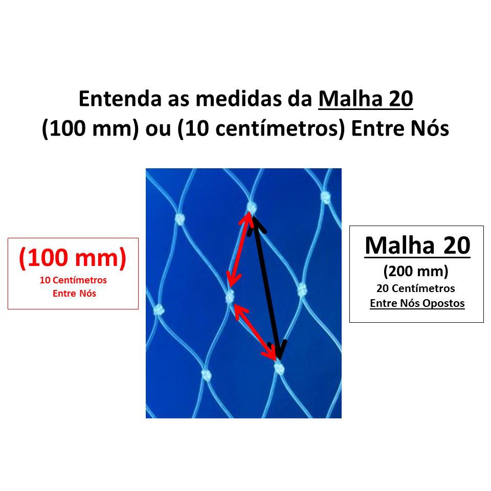 Esta é uma Malha 20 (100mm) são 100mm ou 10 centímetros entre nós e a Malha inteira esticada tem 20 centímetros! Panagem de Rede Malha 20 = ( 0,50x100x48x100 ) Fio 0,50 mm 100 mm entre Nós ( 10 Centímetros entre Nós ) = Malha 20 48 Malhas de Altura X 20 = ( 9,60 Metros de Altura ) 100 Metros de Comprimento ( 500 Malhas no Comprimento ) X 20 = 100 Qualidade Superior! Fabricadas com ourela dupla, são uma opção mais acessível, com alto padrão de qualidade! REDE OU PANAGEM, EM ALGUMAS REGIÕES SE USA TERMOS DIFERENTES AO SE REFERIR AO TAMANHO DA MALHA EM UMA DAS FOTOS DO ANUNCIO TEM AS MEDIDAS REFERENTE AO "" TAMANHO DA MALHA "" OBRIGADO POR VISITAR NOSSOS ANÚNCIOS! Estamos à disposição! DESDE JÁ, AGUARDAMOS SUA COMPRA! OBRIGADO!!!