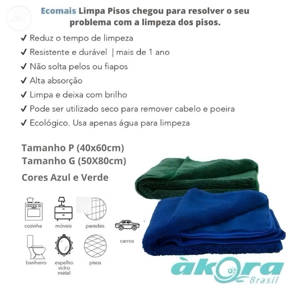 ECOMAIS LIMPA PISOS ÁKORA – ECONOMIZE ATÉ 50% DO TEMPO DE LIMPEZA! O Ecomais Limpa Pisos Ákora é a solução definitiva para quem deseja uma limpeza eficiente e prática. Desenvolvido para garantir um resultado impecável em pisos internos, esse pano inovador captura toda a sujeira, poeira e até óleos de maneira rápida, sem deixar resíduos ou danos ao seu ambiente. Com o Ecomais Limpa Pisos, você pode dizer adeus ao trabalho extra com produtos químicos, já que ele funciona com apenas água, sendo ecologicamente correto e superdurável. Principais Benefícios: Limpeza Rápida e Eficiente: Economize até 50% do tempo de limpeza. Sem Resíduos: Não deixa marcas, restos de sujeira ou produtos químicos. Sustentável e Seguro: Usa apenas água, sem necessidade de químicos agressivos. Brilho Impecável: Deixa o piso brilhando e limpo, como novo, sem esforço. Tamanho Ideal para Facilitar sua Limpeza: Tamanho P (40x60 cm), perfeito para limpar todos os tipos de pisos internos. Como Usar o Ecomais Limpa Pisos: Para sujeira leve (poeira e sujeira superficial): Pulverize água no piso e passe o pano Ecomais Limpa Pisos. Para sujeira mais pesada: Molhe o pano em um balde com água, retire o excesso e limpe áreas de aproximadamente 4m². Repita o processo até concluir toda a área. Dica: Para pisos de madeira, pulverize a água diretamente no pano, nunca no piso. Perguntas Frequentes: Qual a diferença entre o Ecomais Limpa Pisos e outros panos comuns? O Ecomais Limpa Pisos é mais eficiente na captura de sujeira, pó e óleos, limpa rapidamente e não deixa resíduos. Além disso, não precisa de produtos químicos, sendo muito mais sustentável e seguro para sua saúde. Posso usar com produtos químicos? Sim, mas o uso de produtos químicos pode reduzir a vida útil do pano. É recomendado o uso de água para um desempenho ideal. O pano solta tinta nas primeiras lavagens? Sim, isso pode acontecer com tecidos novos. Para minimizar, ferva o pano por 3 minutos antes de usá-lo. Qual a durabilidade do Ecomais Limpa Pisos? Com cuidados adequados, sua vida útil pode superar 2 anos. Como lavar o Ecomais Limpa Pisos? Lave com sabão neutro ou produtos da linha Ákora. Evite amaciantes e secar ao sol para preservar as fibras e a durabilidade do pano. Posso usá-lo para grandes áreas envidraçadas? Sim, o Ecomais Limpa Pisos é eficaz em áreas envidraçadas. Para grandes áreas externas, recomendamos o modelo específico para área externa, que é mais fácil de limpar após uso em locais com folhas ou pelos. Praticidade e eficácia ao seu alcance! O Ecomais Limpa Pisos foi feito para quem valoriza tempo, qualidade e um ambiente saudável. Faça a escolha certa para a sua limpeza e aproveite o envio imediato!